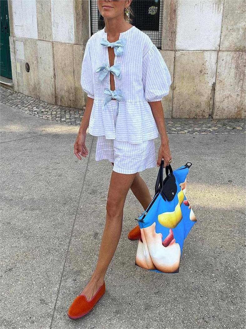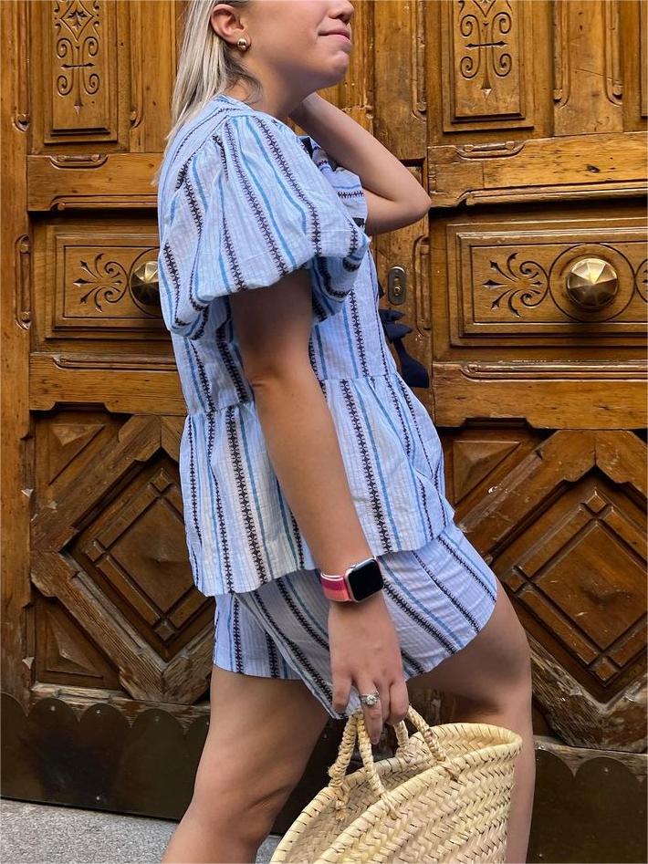 Step into timeless elegance with our Blue Bow Striped Blouse Set. This charming ensemble features delicate stripes and a feminine bow detail, perfect for adding a touch of sophistication to any occasion.