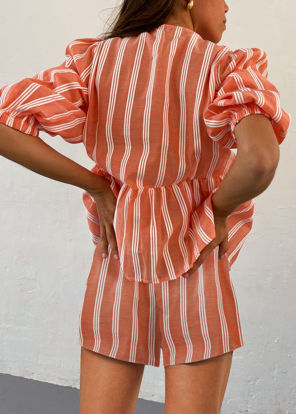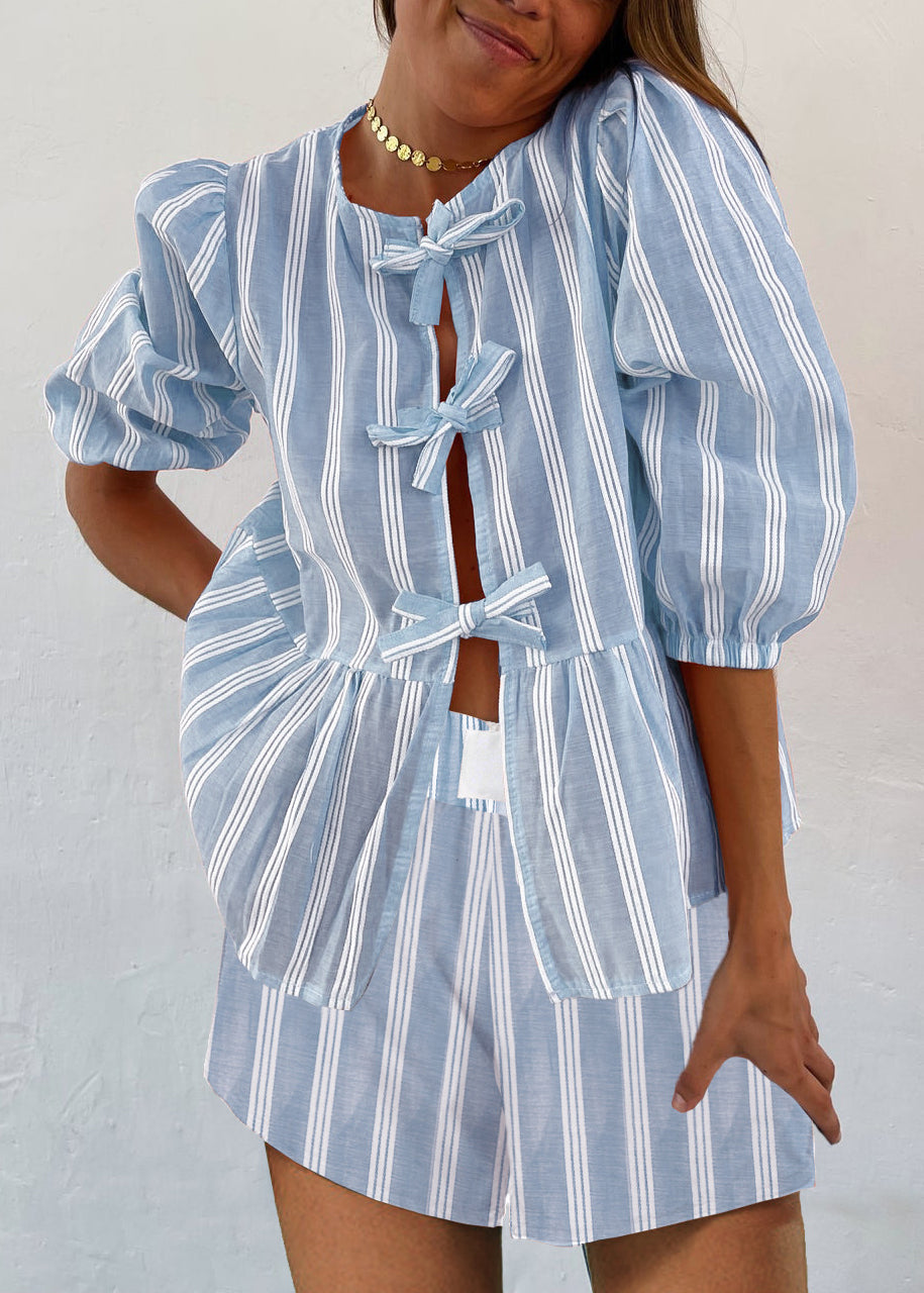 Women's Drawstring Striped Short Sleeve Shorts Set