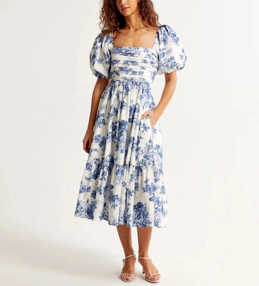 This flattering short-sleeved midi dress is made from our classic poplin fabric and features stylish puff sleeves, ruffle detailing on the bodice, a tiered skirt with pockets and a square neckline.