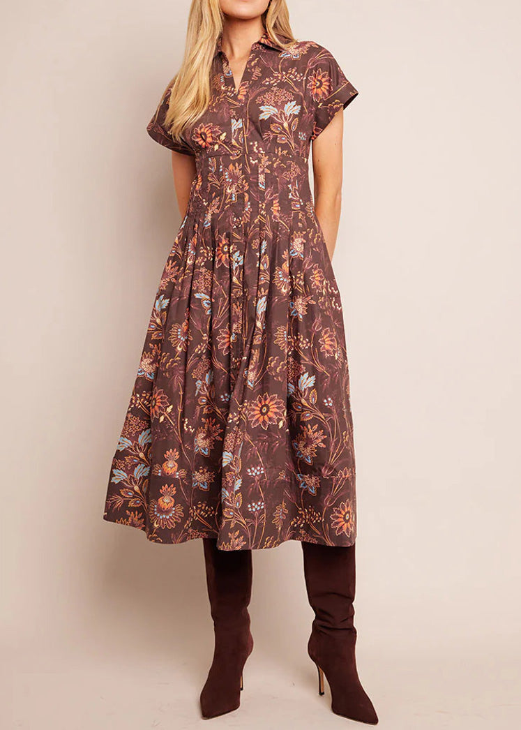 • SPU:DRHM24090507• Midi length shirt dress designed for fit and flare look• Center front placket opening is functional• Functional side seam pockets• Stitching detail at skirt yolk and bottom hem• Pin tucks at waist• Sleeve hem has double rolled cuff• Has internal elastic at waist for ease• Unlined• 100% Cotton Poplin• Dry Clean Only or Hand Wash Cold