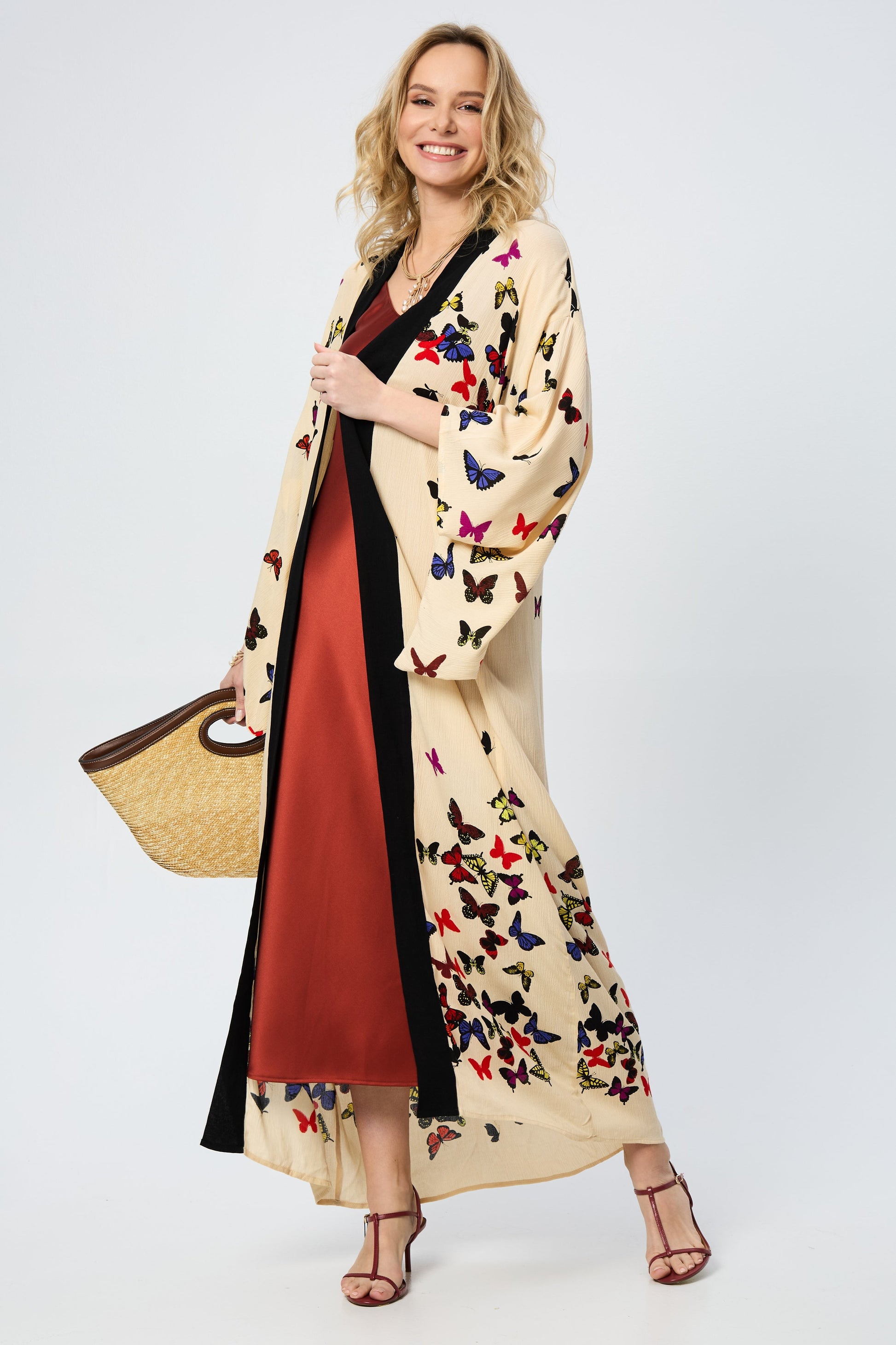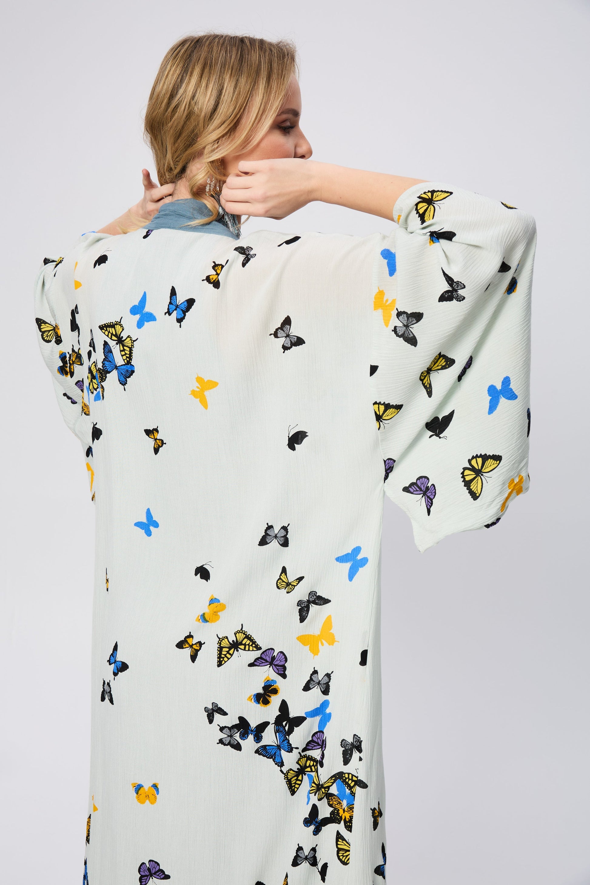 Our Scattered Butterfly Kimono features an open-front silhouette that drapes effortlessly around you, showcasing billowing sleeves and exuding an aura of grace and sophistication. The lightweight and breathable fabric showcases a collection of colorful butterfly motifs, making it perfect for spring and summer.