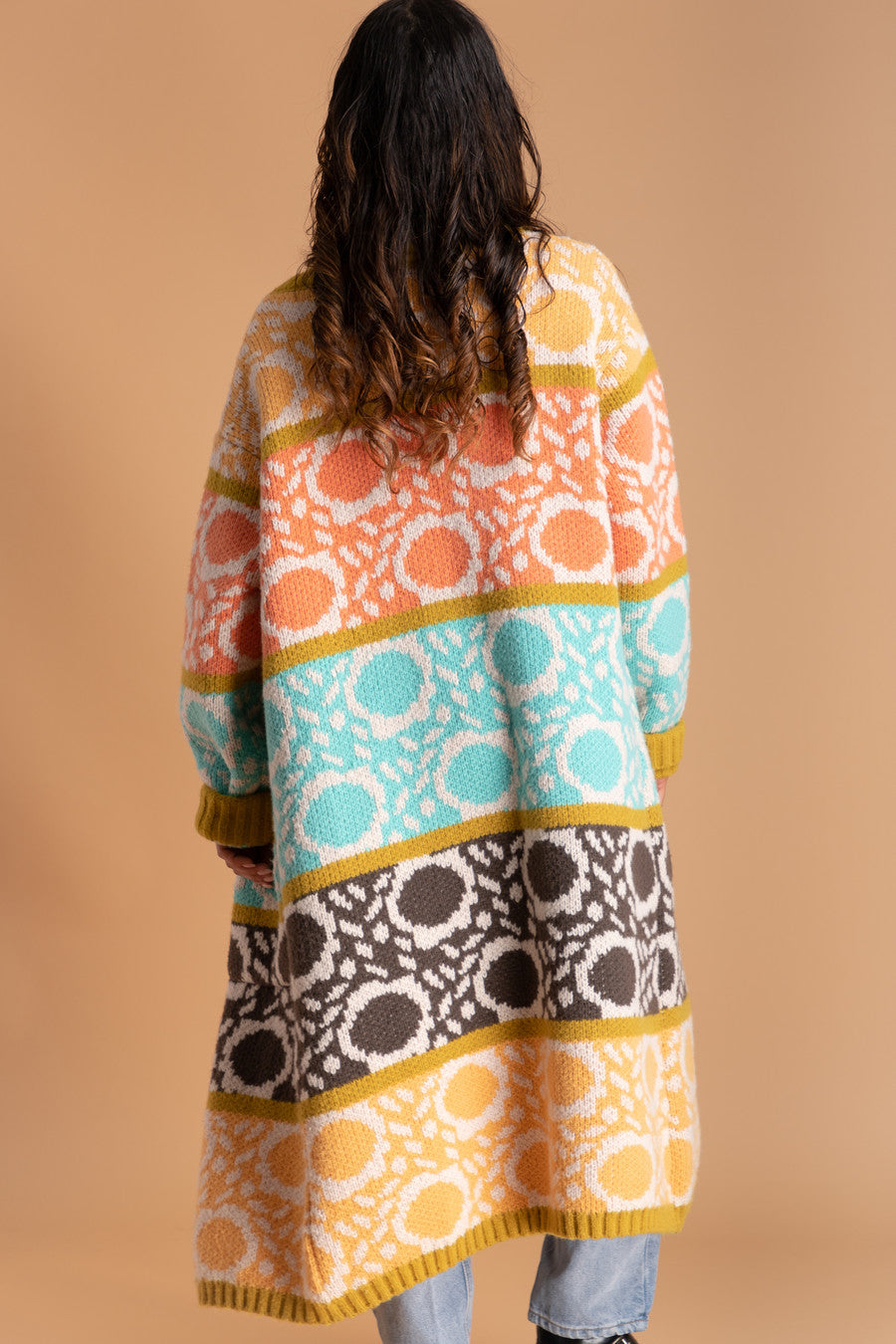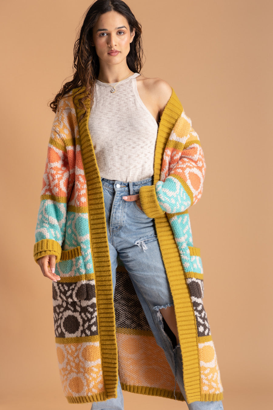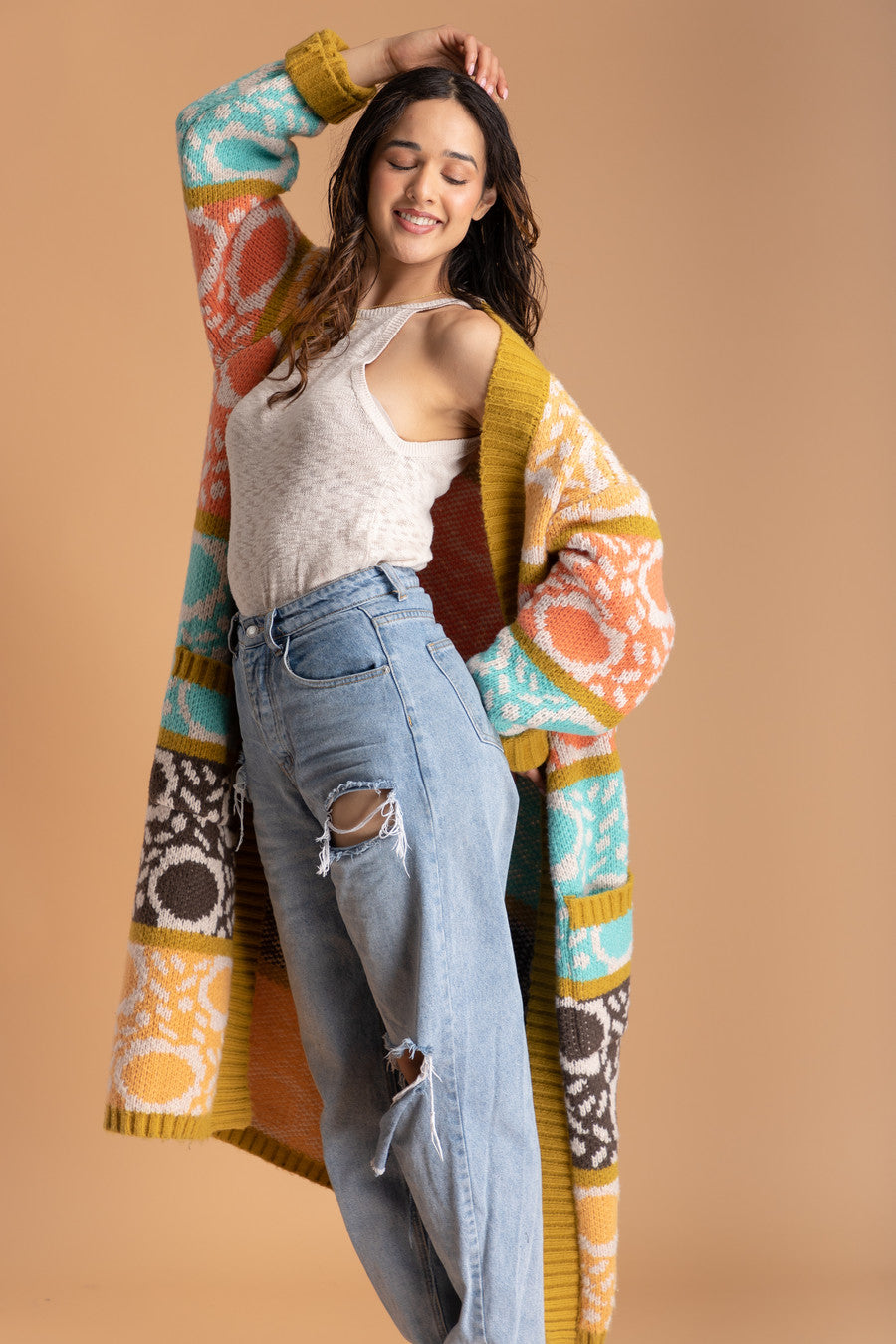 Our Carina multi-long knit kimono is a fiesta of sun-touched hues with a bright and bold array of stylized floral patterns. A must-have layering option to warm you up this fall season. An oversized cozy fit.