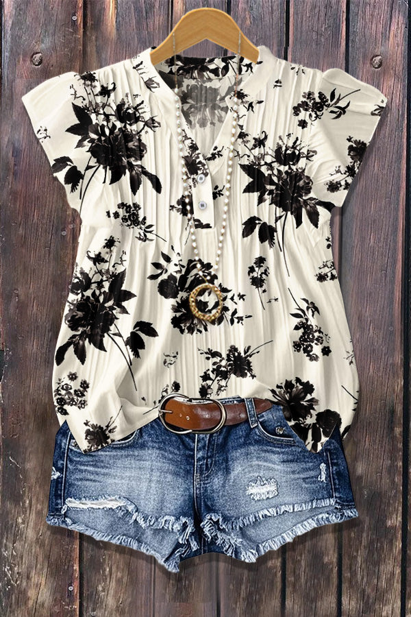 Chic Floral Print Flutter Sleeve Ribbed Top