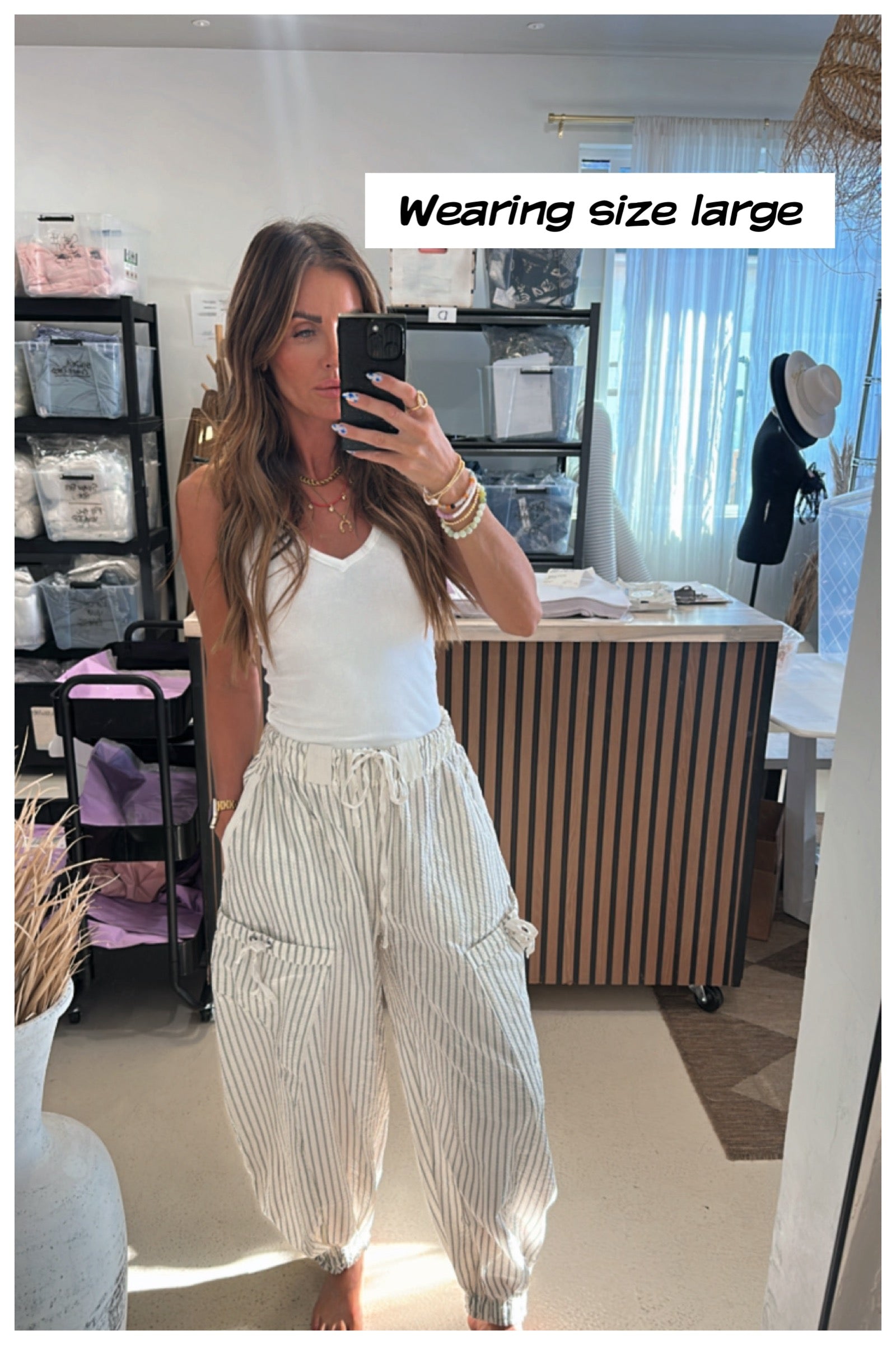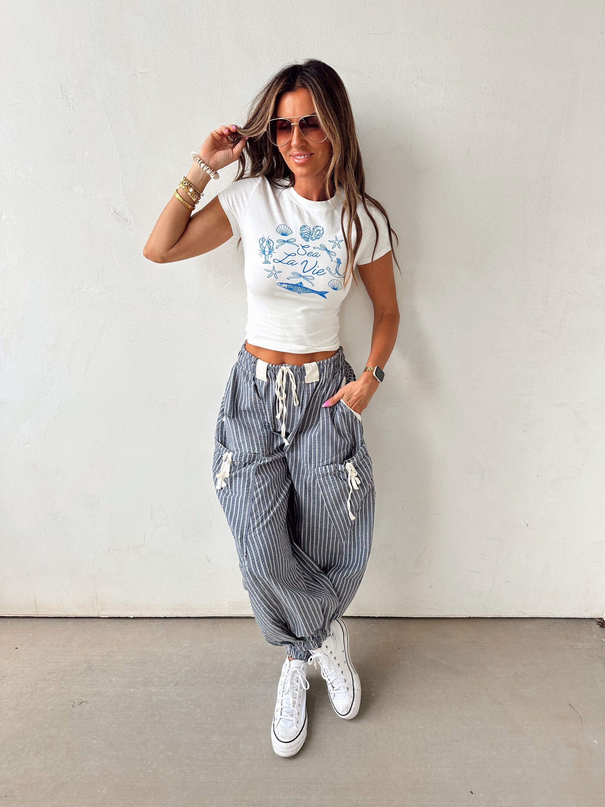 Easy, breezy, and effortlessly cool—your new go-to for beach days or casual strolls. Designed with a relaxed silhouette and subtle pinstripe texture, they’re detailed with playful tie pockets and gathered ankles for a laid-back yet polished vibe. Available in three coastal-inspired colorways.