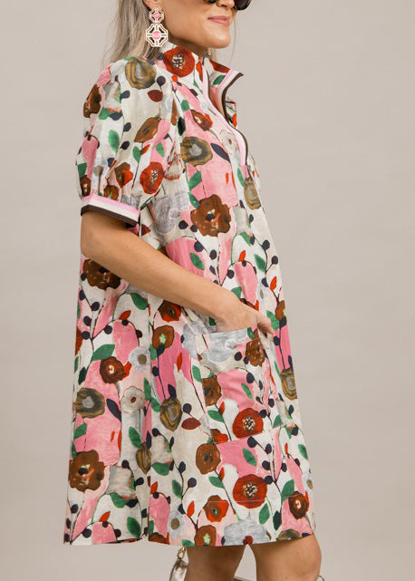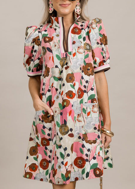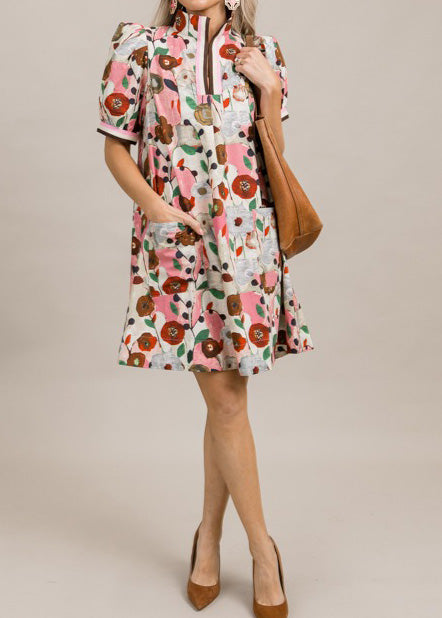 We're carrying our flirty floral style right into fall with this cute new dress. A pink, ivory, and brown stripe band trims the neckline and sleeves, creating a chic and modern look. The fit flows effortlessly on the body thanks to strategically placed pleats on the center of the front and back. Dress features a standing collar, puff sleeves, and patch pockets. Pair it with anything from sneakers to boots!