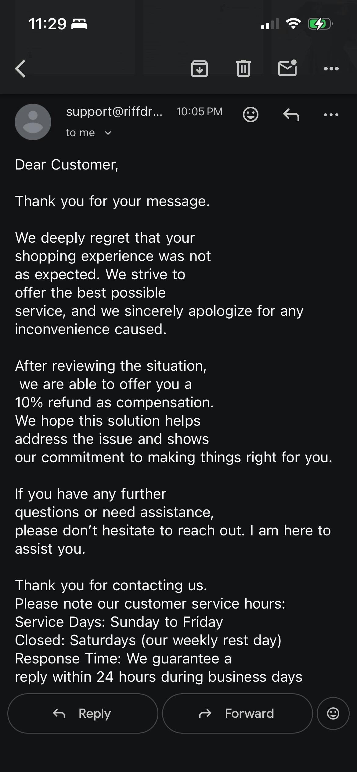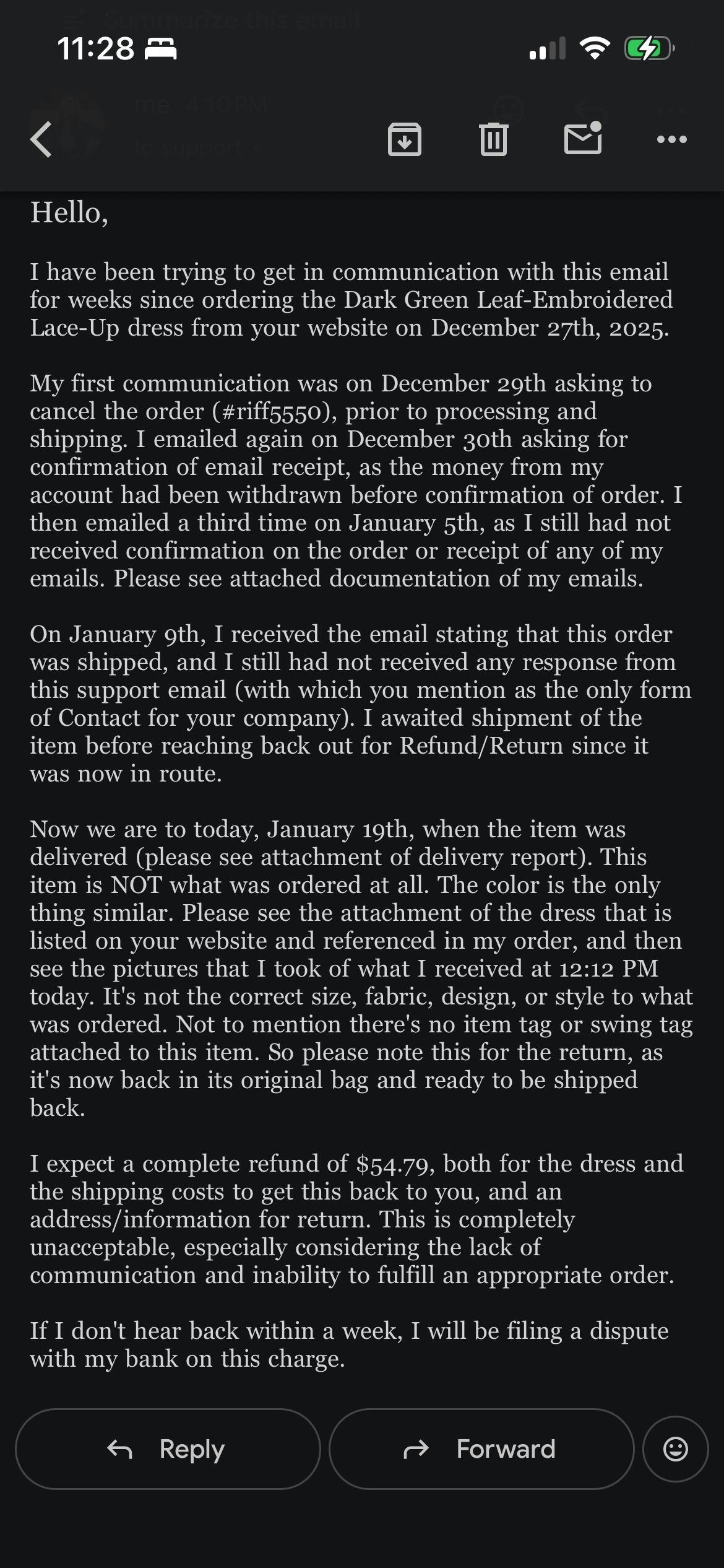 After weeks of waiting with no communication when I attempted to cancel my order, I received a costume dress that was not anywhere near this item. Photos attached. When I sent an email expressing this issue and wanting to return for a refund, I was told that they “reviewed the situation and can offer a 10% refund”. This is incredibly inappropriate given the situation and not acceptable. I will be disputing with my bank on this issue. DO NOT ORDER FROM THIS COMPANY.