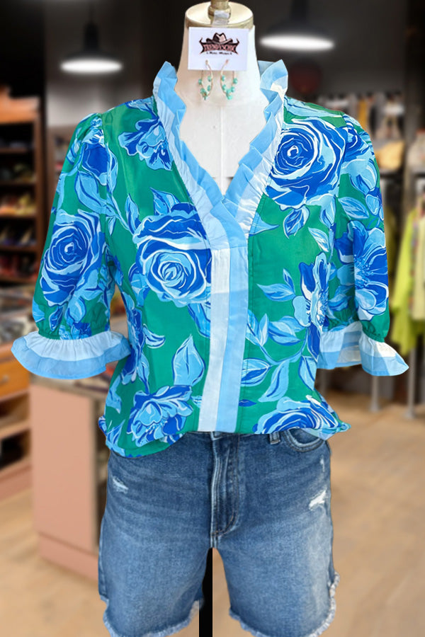 Floral Print Ruffle Neck Puff Sleeve Top