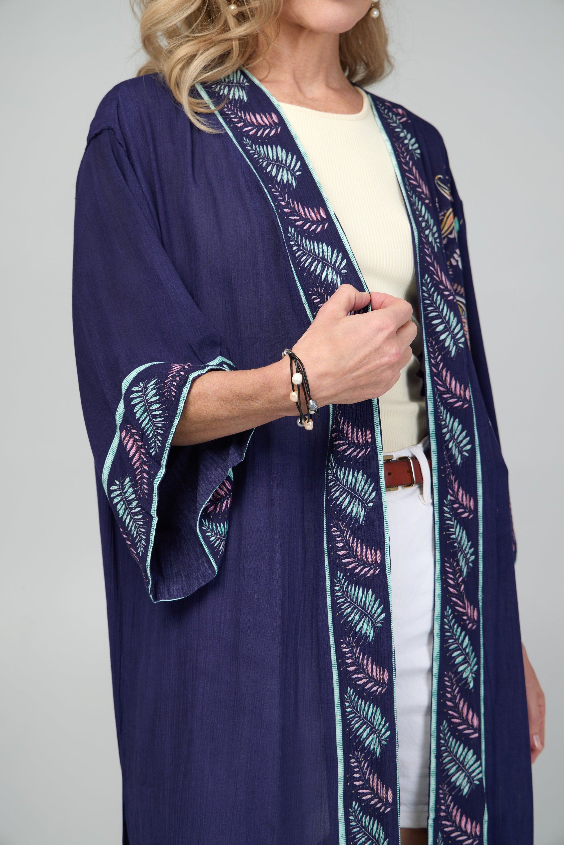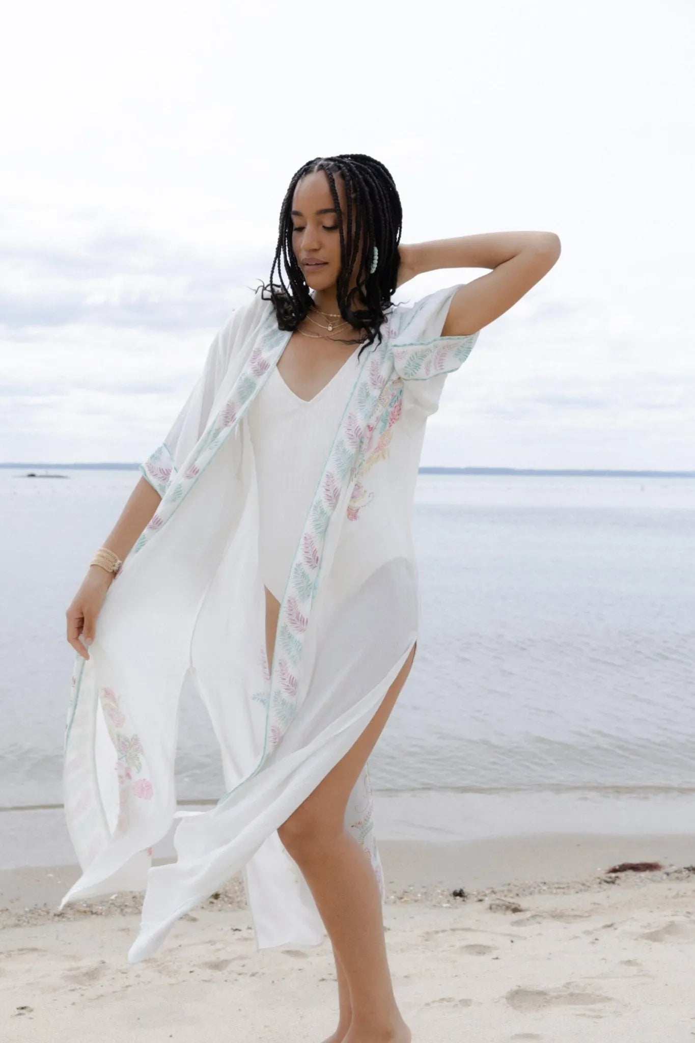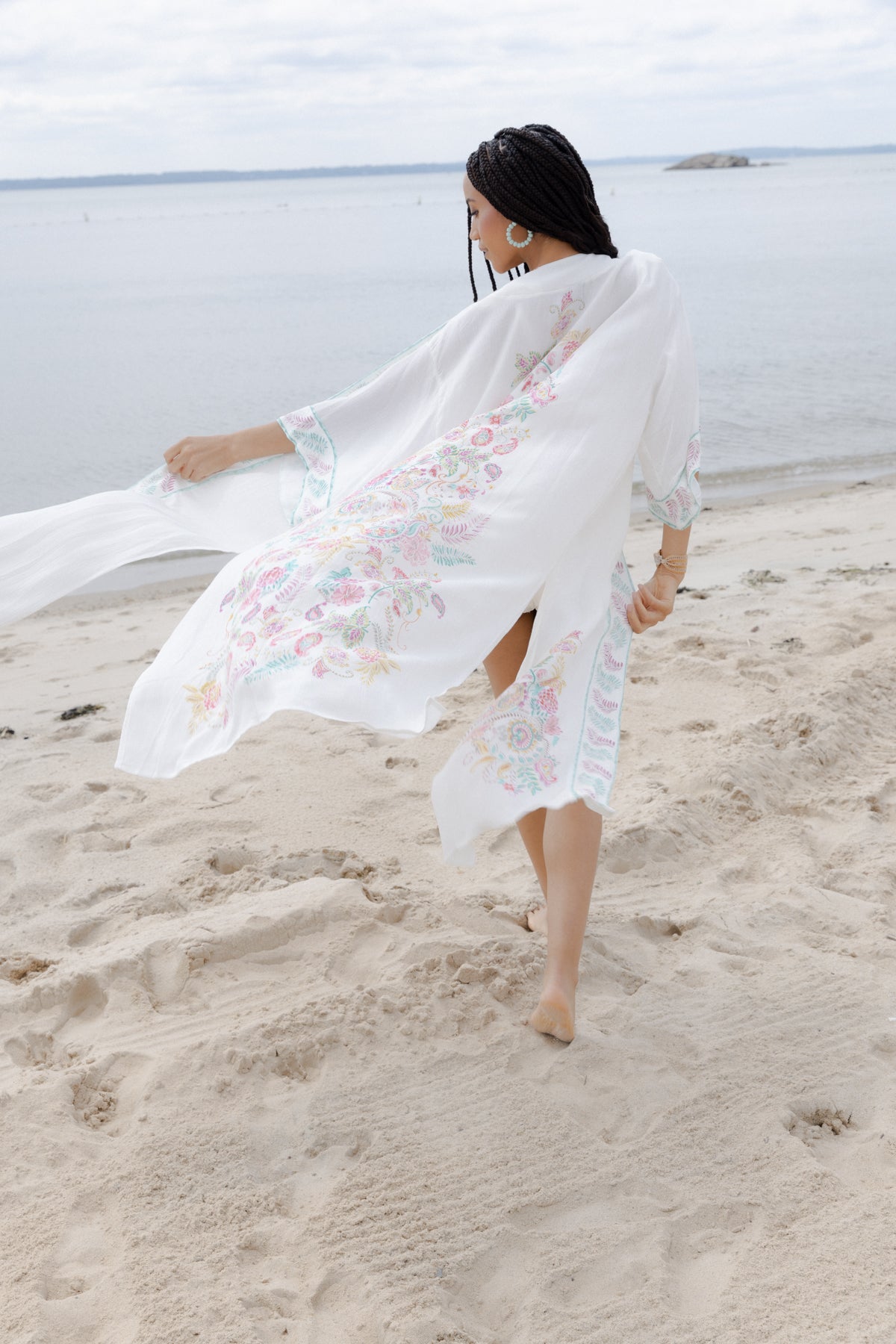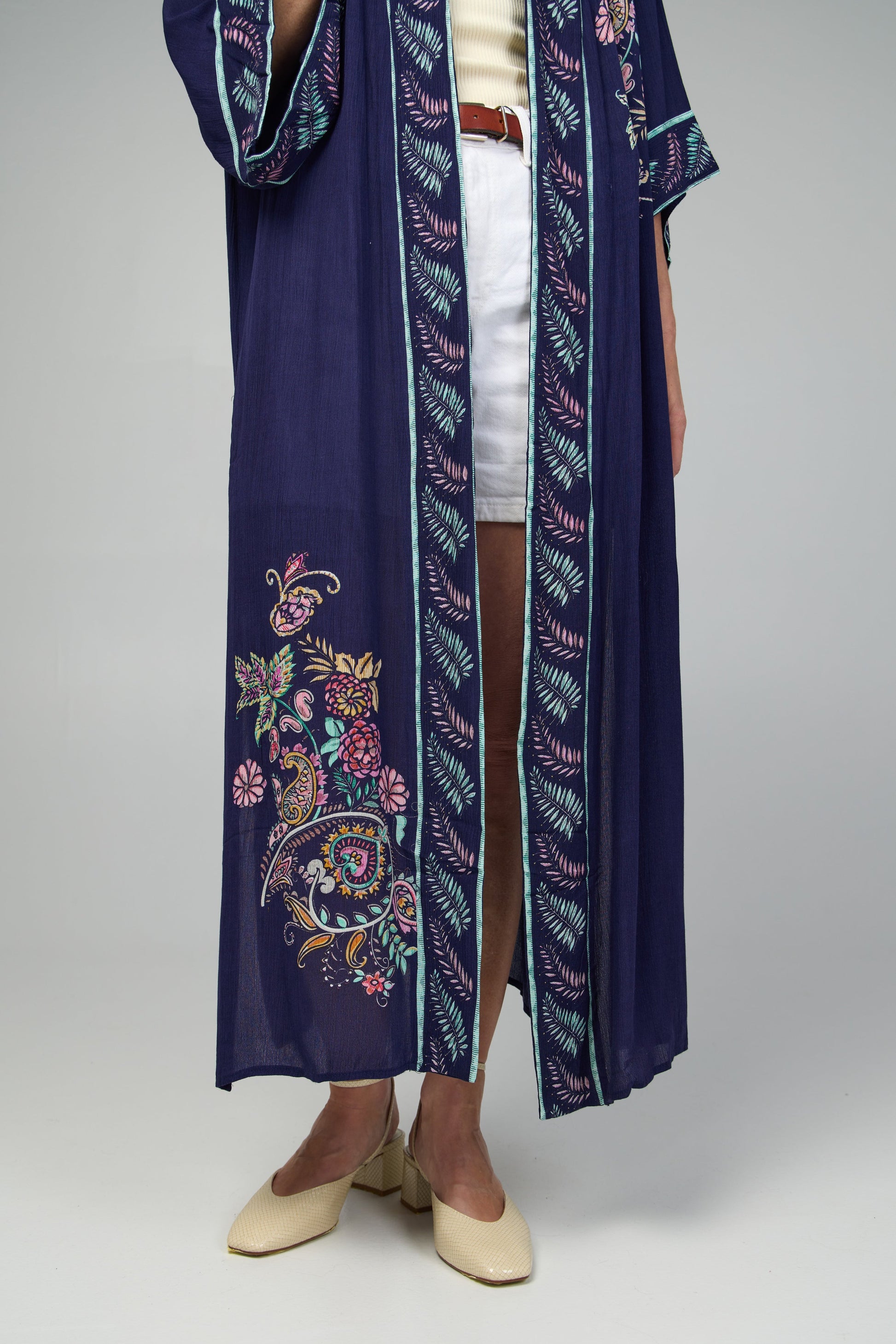 Our exquisite full-length Flowy Paisley Kimono is the perfect addition to your summer collection. Embellished with stunning floral and paisley motifs, this traditional, open-front kimono adds elegance to your wardrobe. Crafted with breathable, lightweight fabric, it is the season's ideal cover-up.
