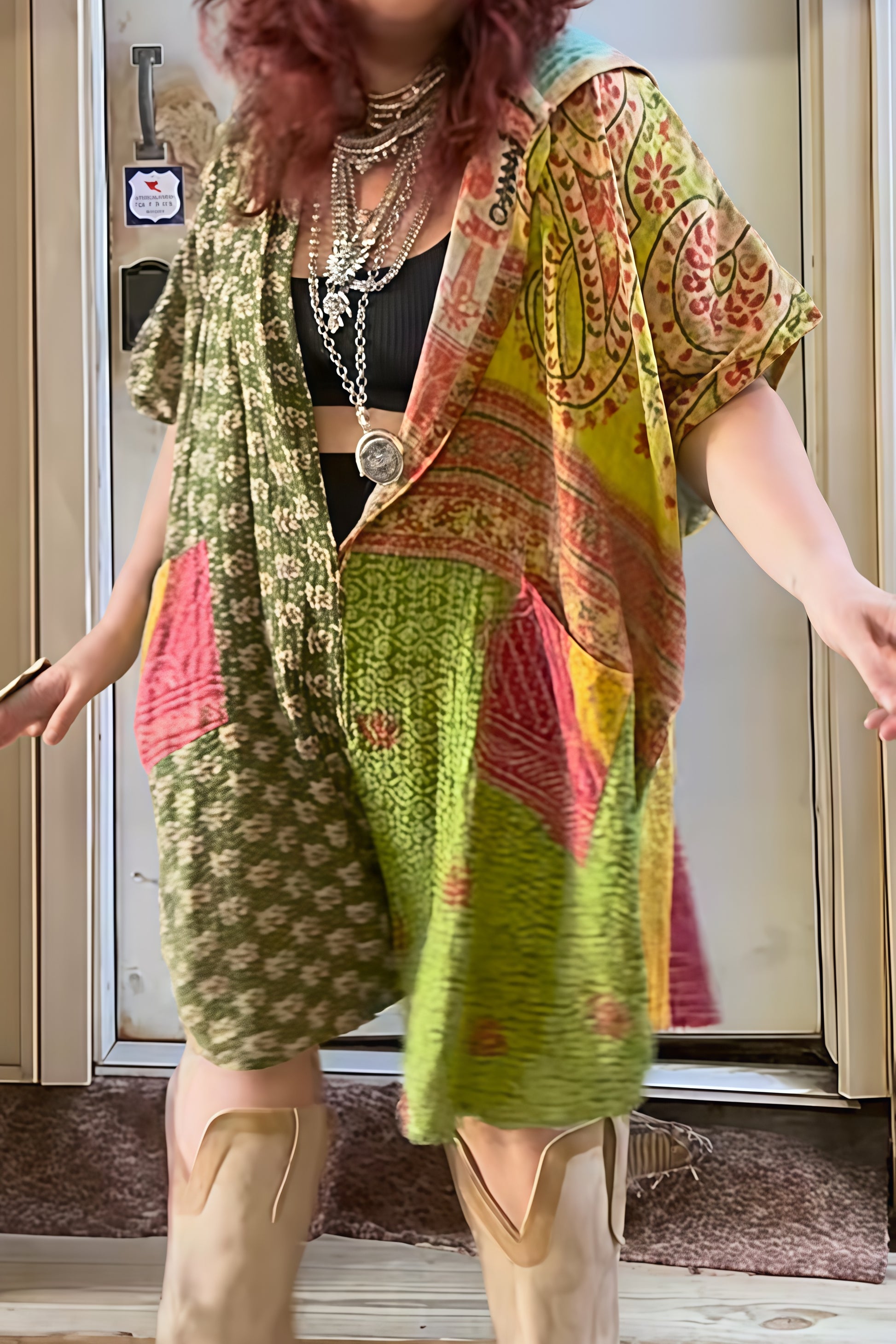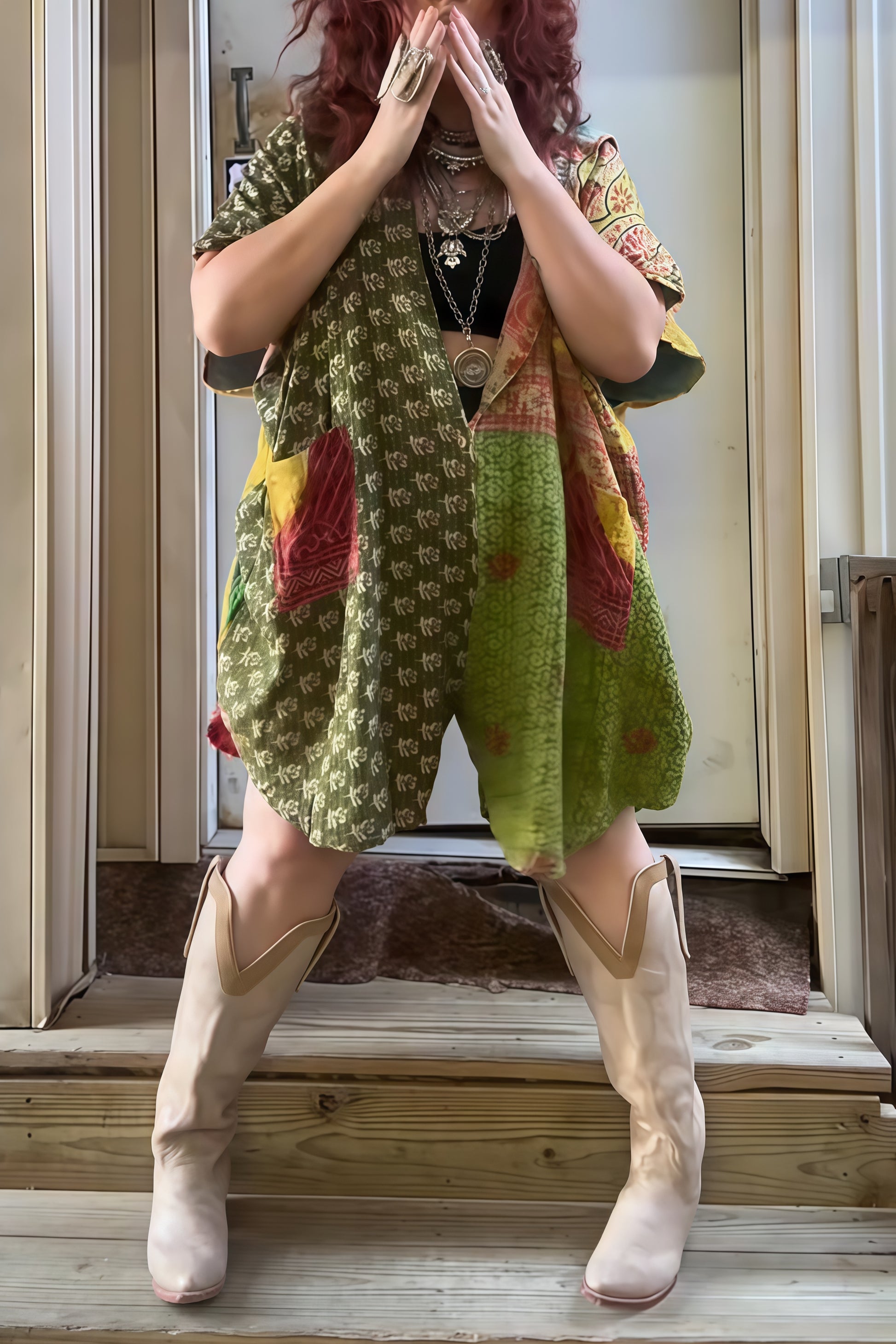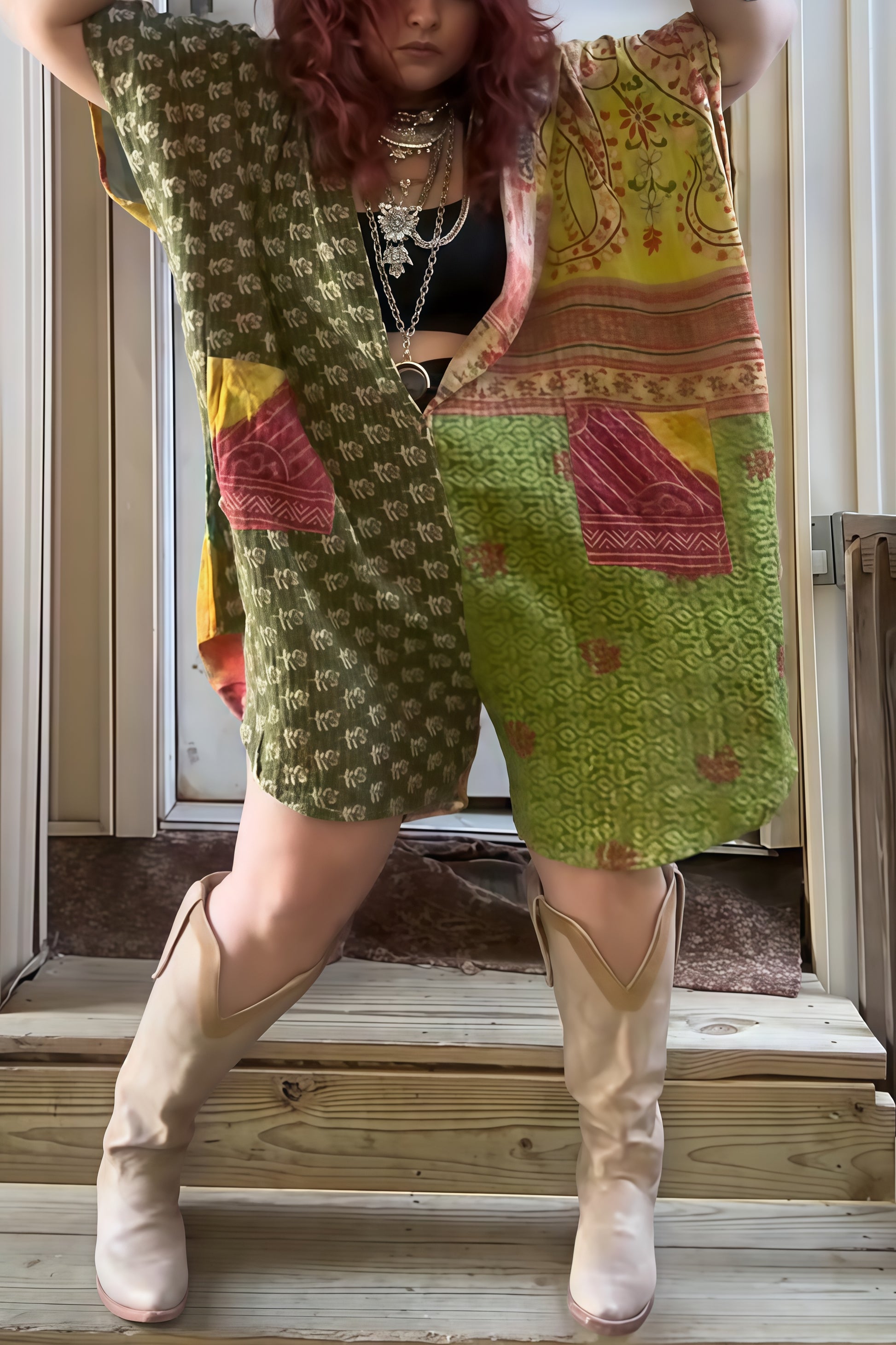 Disclosure: Our vintage styles have lived a full life before becoming the designs in our shop. Fabrics may have small threads or holes in the layers. Color inconsistency or small stains may be present. The saris are sewn together and extend the life of each design. Imperfections should be celebrated