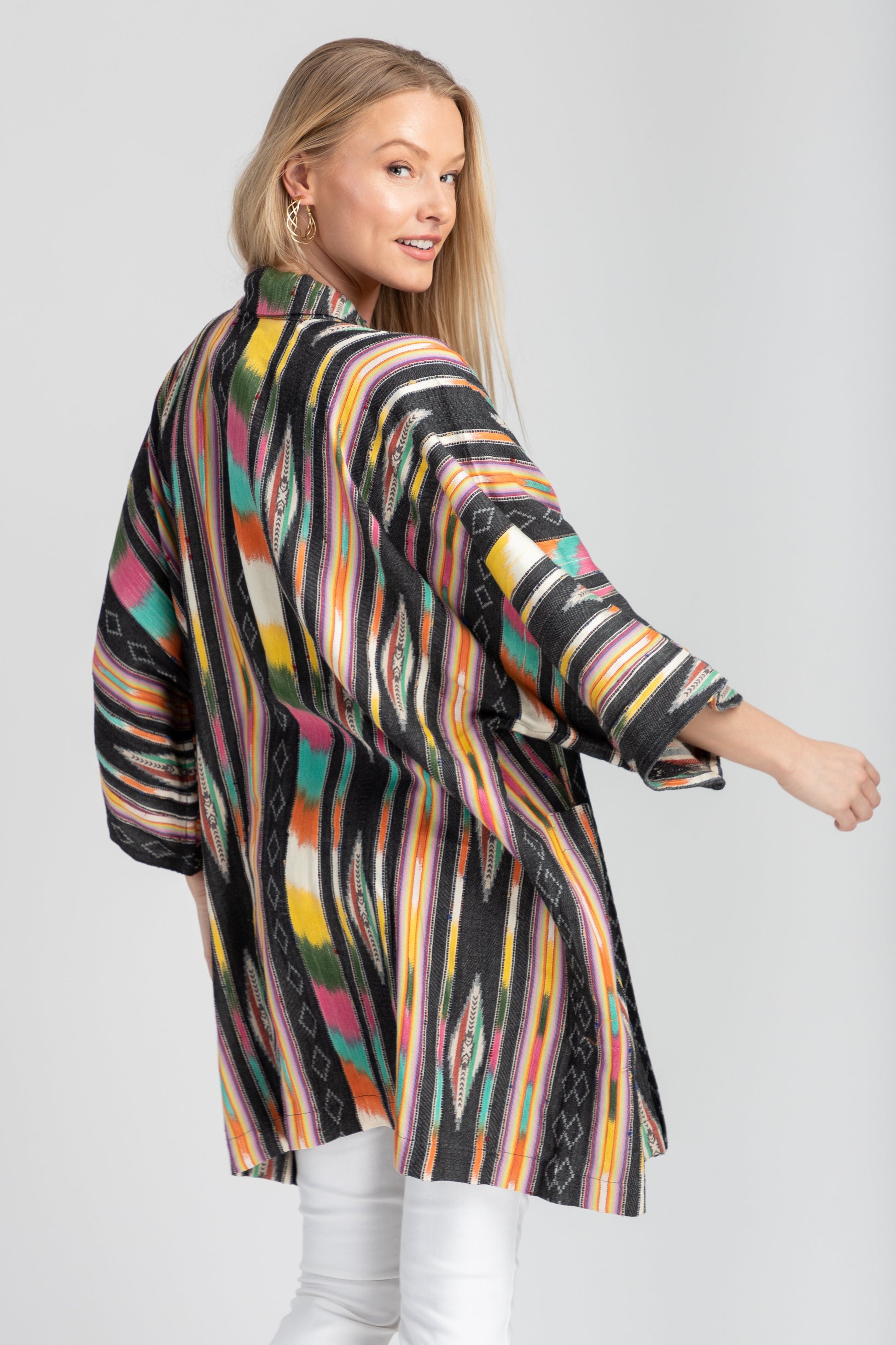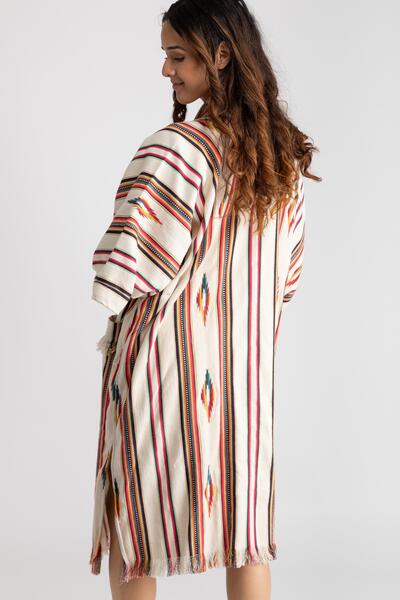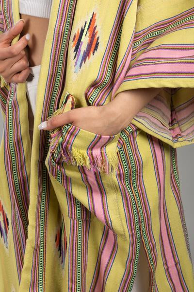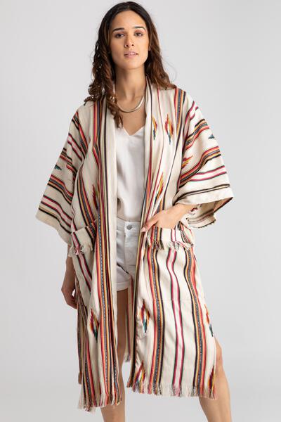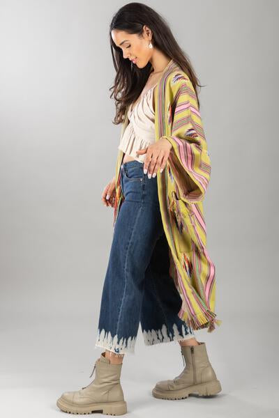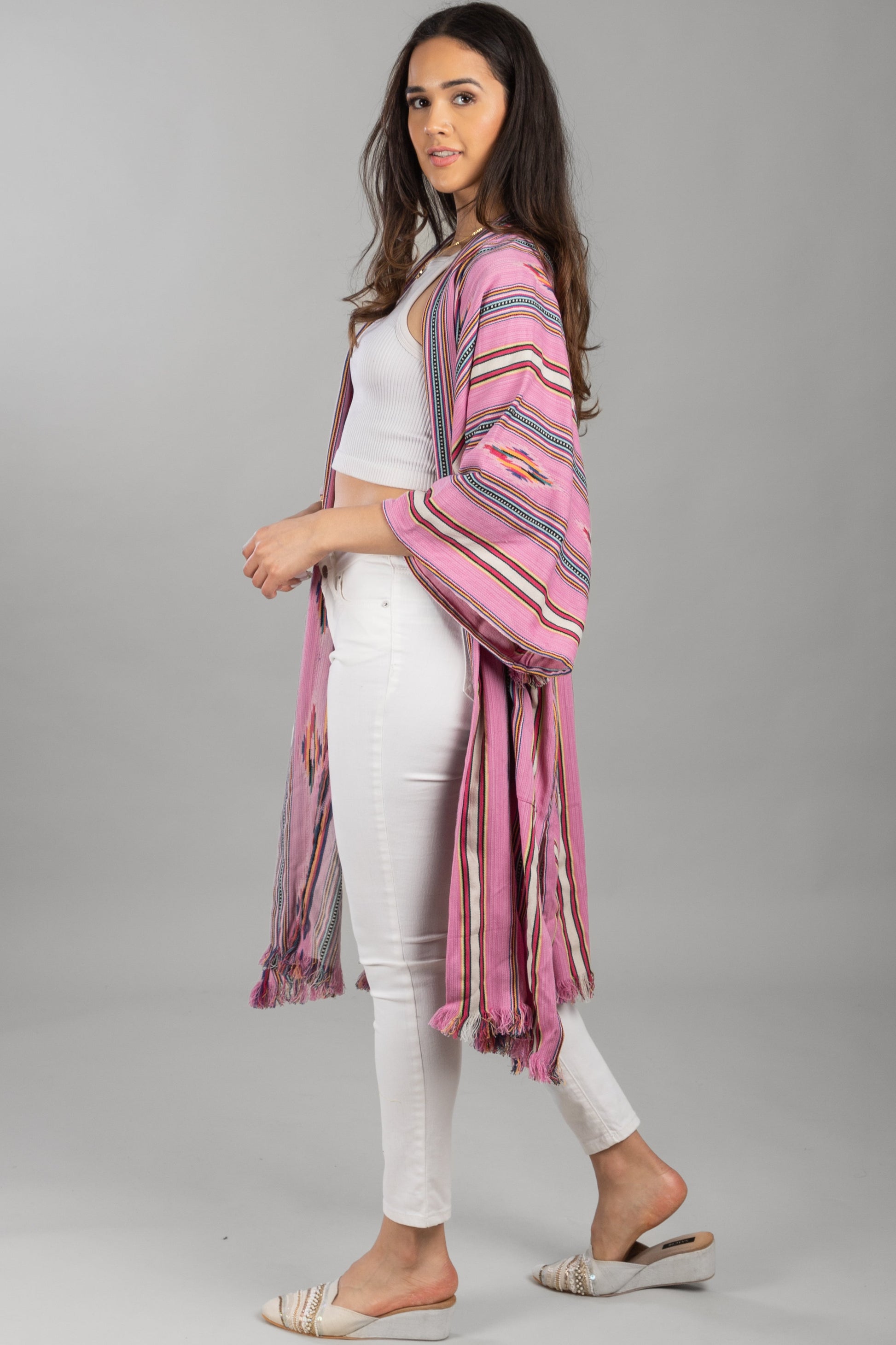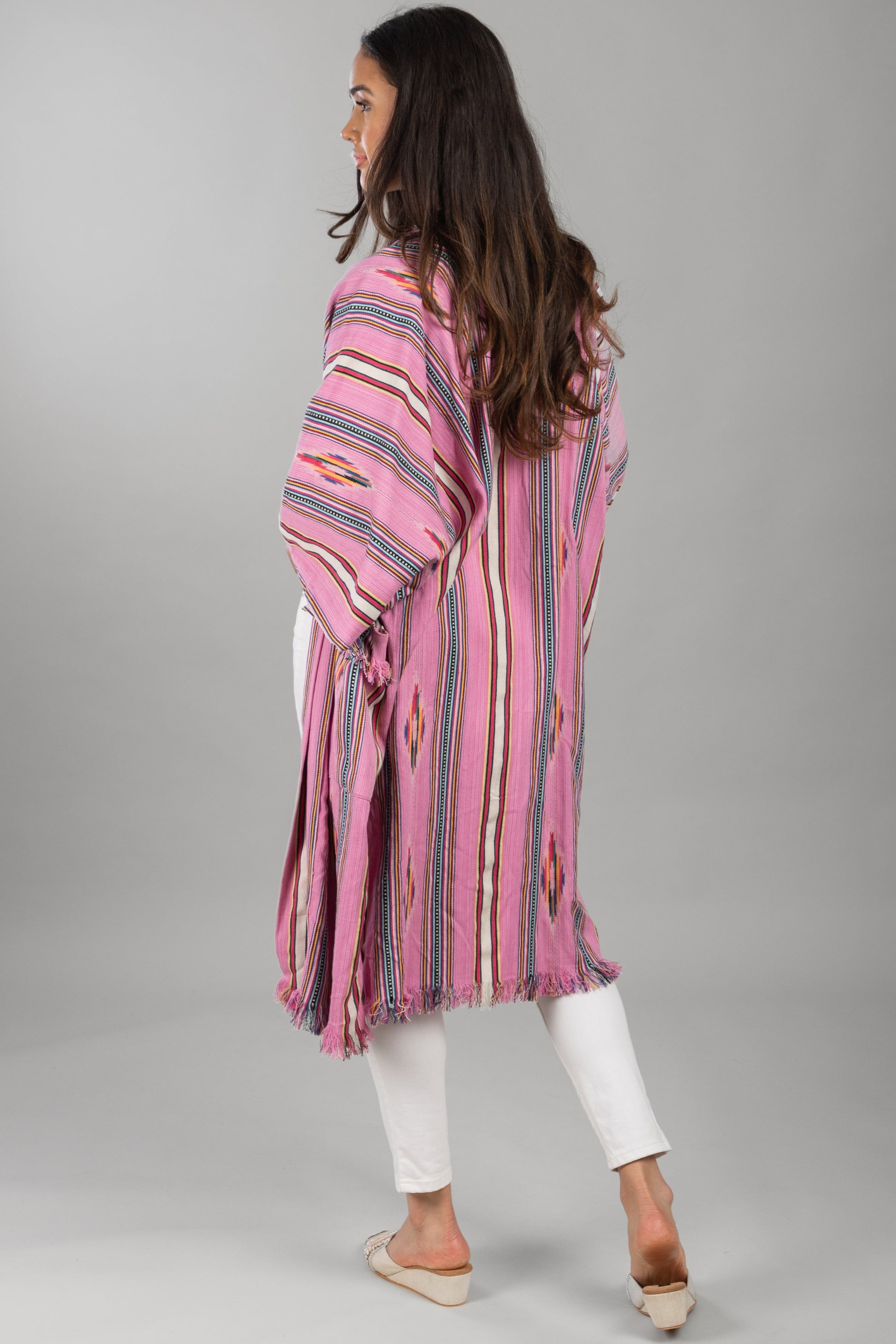 Stay comfy and stylish with our colorful Aztec-inspired kimono. This long, breathable piece features two deep pockets, making it functional and fashionable for any occasion. The comfortable material makes this piece great for both indoor and outdoor wear.