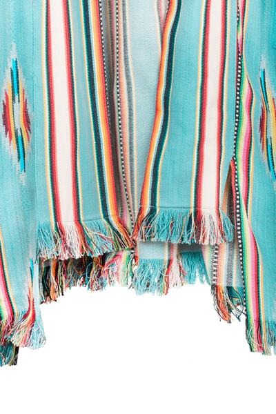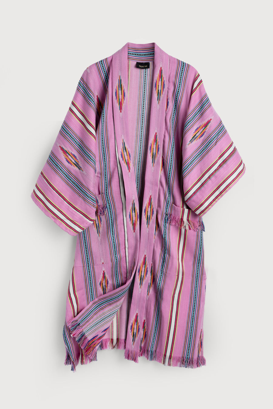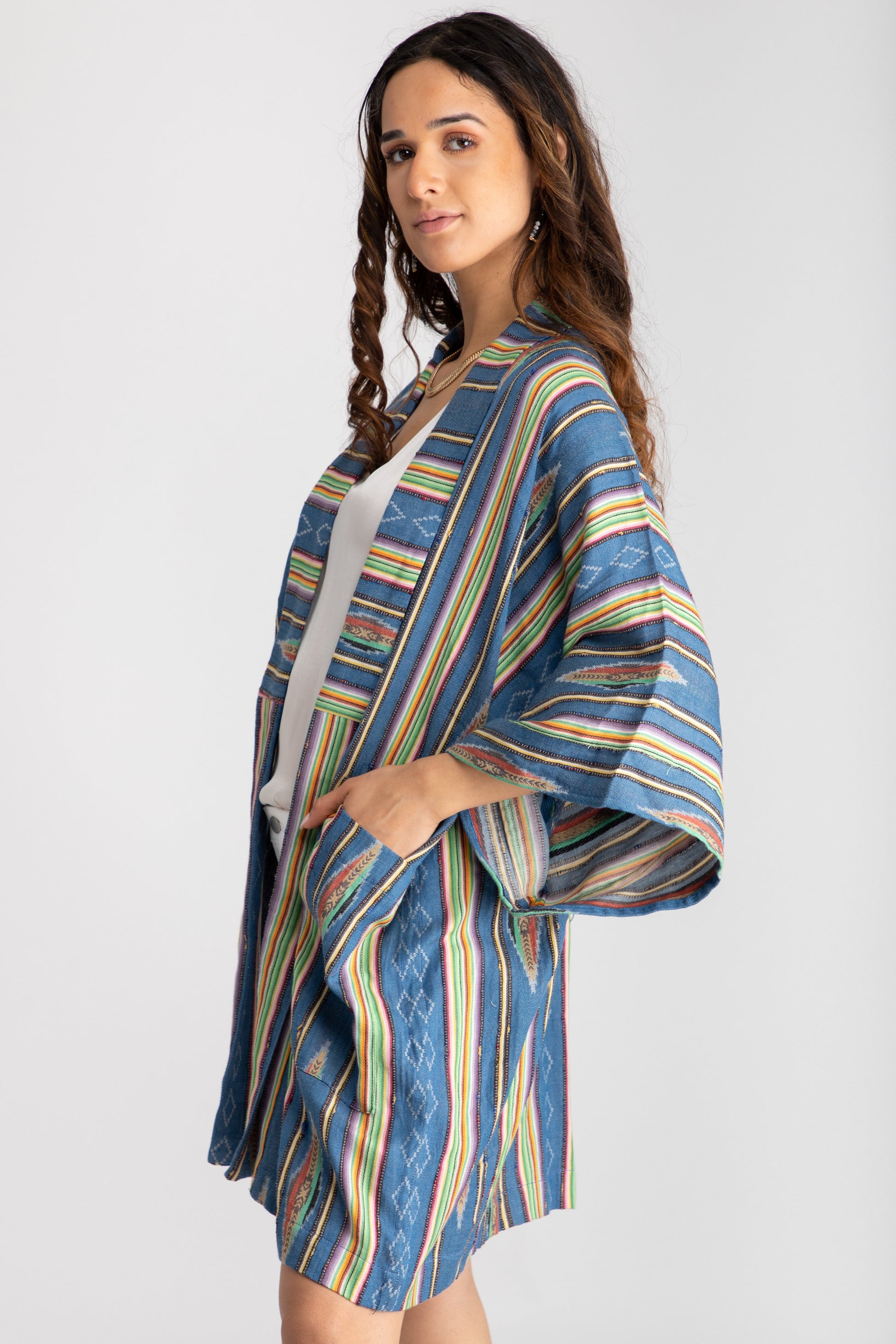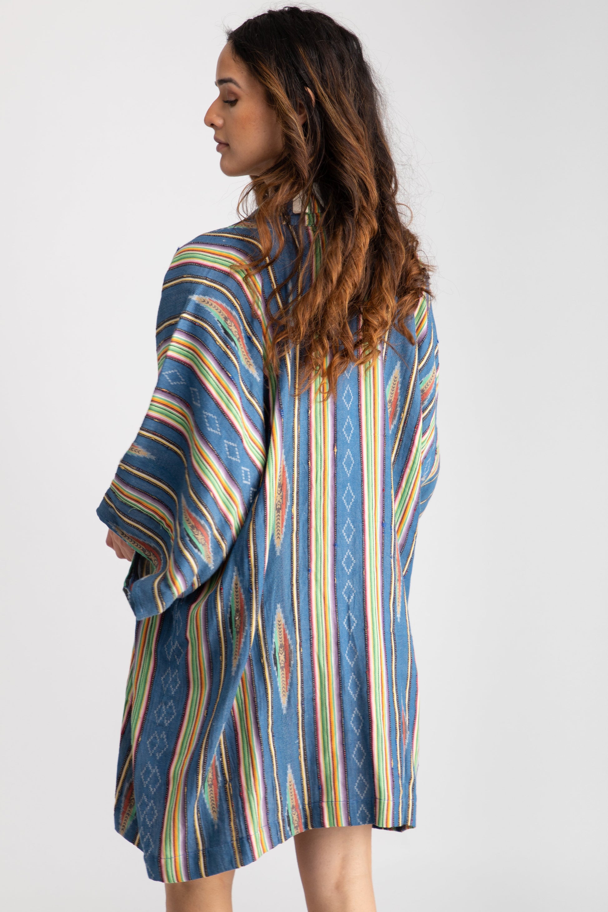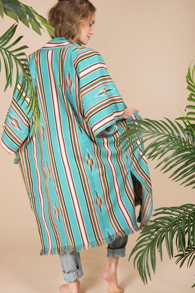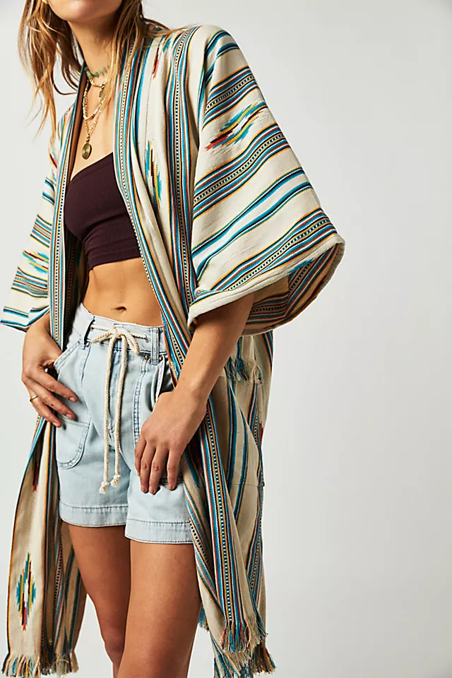 Stay comfy and stylish with our colorful Aztec-inspired kimono. This long, breathable piece features two deep pockets, making it functional and fashionable for any occasion. The comfortable material makes this piece great for both indoor and outdoor wear.