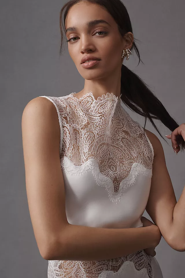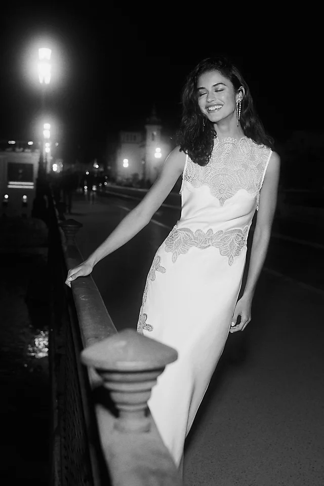 A vision of timeless elegance, the Joanna Maxi Dress blends romantic lace with modern structure. Designed with a high neckline and sleeveless silhouette, this dress features semi-sheer lace panels at the chest, waist, and sides—creating a play of light and texture that feels both graceful and alluring. The lightweight lace fabric offers subtle transparency for a refined yet bold look, while the concealed zipper at the back ensures a smooth fit.
