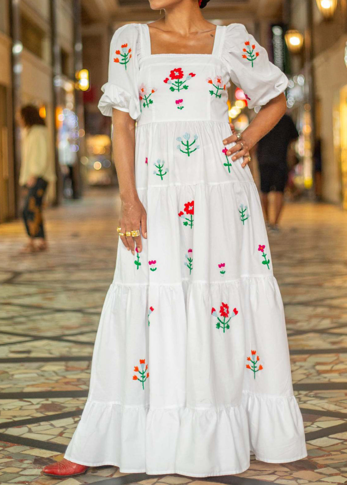 Floral Embroidery Square Neck Puff Sleeve Long Dress