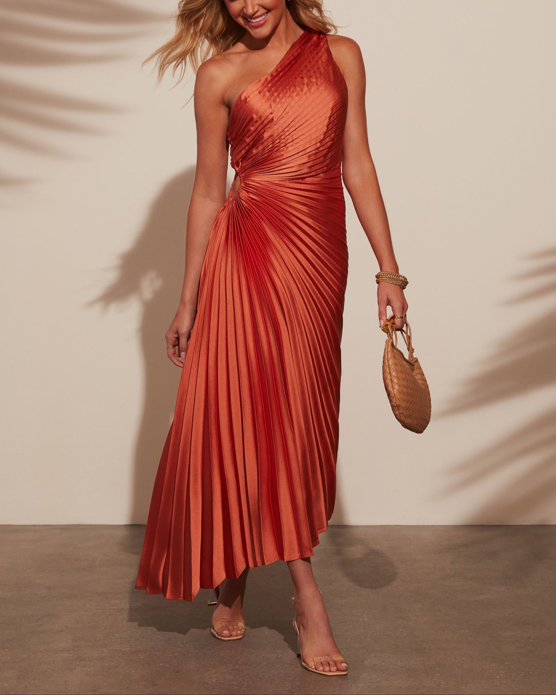 Look chic at your next formal gathering with the Modern Day Glam Satin Pleated One Shoulder Cutout Asymmetrical Maxi Dress. Its pleated design and asymmetrical hem make such a bold statement!