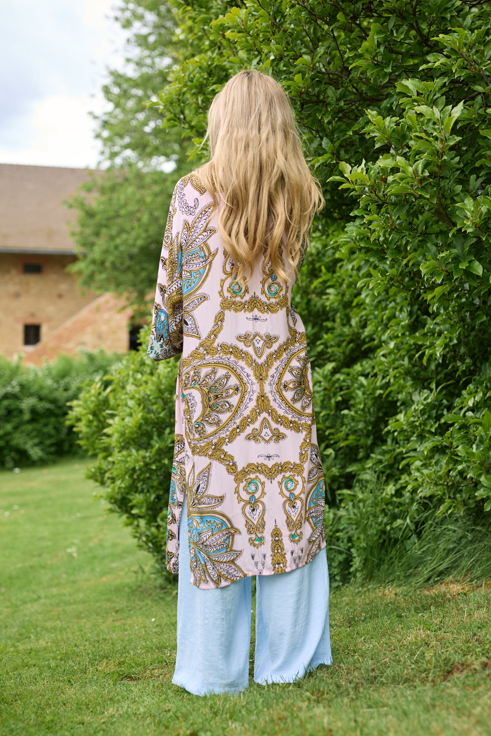 Discover our long Multicolored Paisley Kimono Duster! This duster displays beautiful, large, multicolored paisleys and regal medallion prints mixed with botanical and floral elements. The fabric belt can securely close the kimono, making it a great cover-up at the beach or a resort.