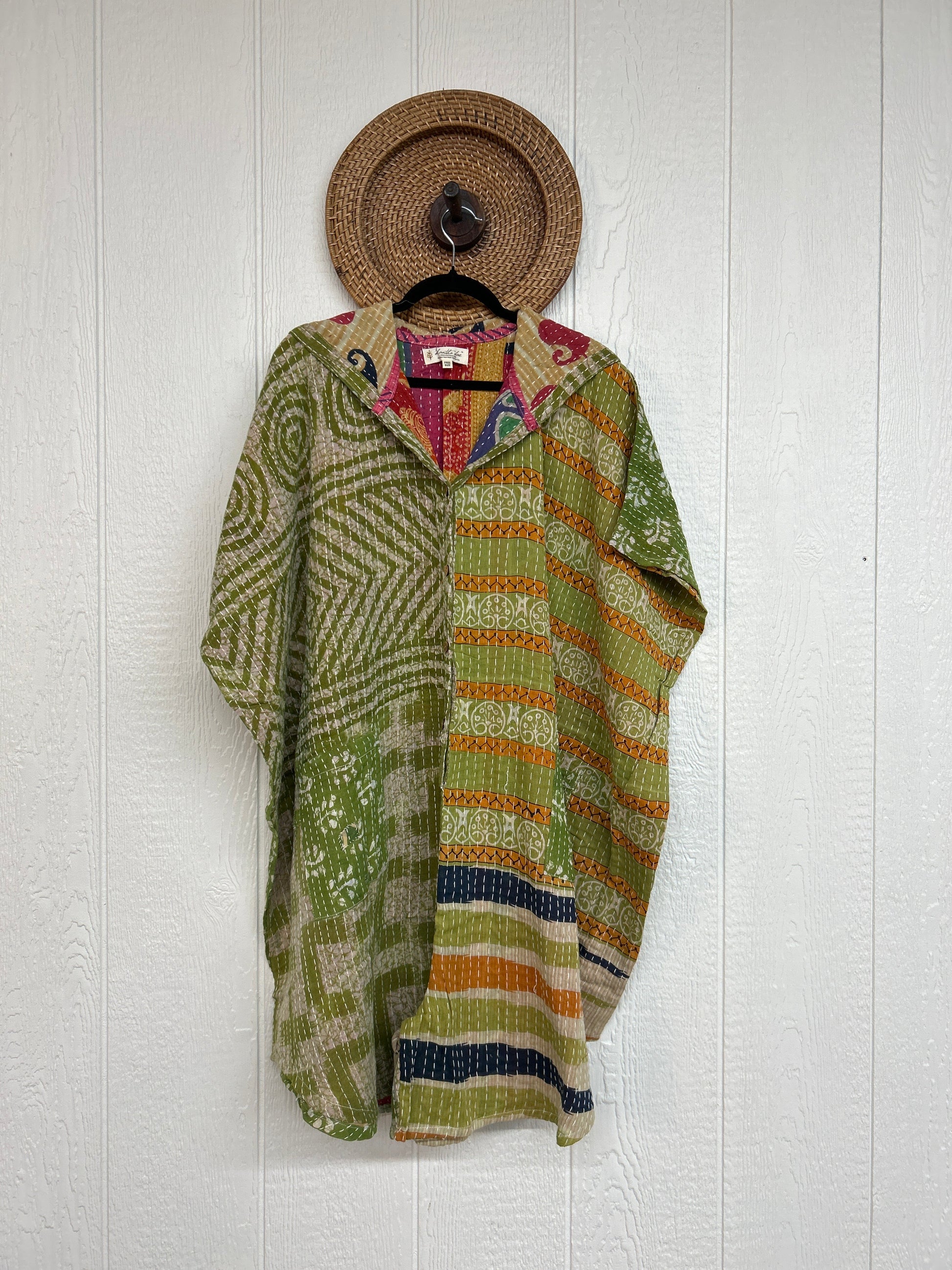 Made from our hand Kantha stitched cotton sari, this one piece wonder features a hood, front button-down closure, pockets, and super flowy shorts. Size Recommended 00-20/22. Crafted and sewn by families in a small village in Northern India, providing work and a fair living.