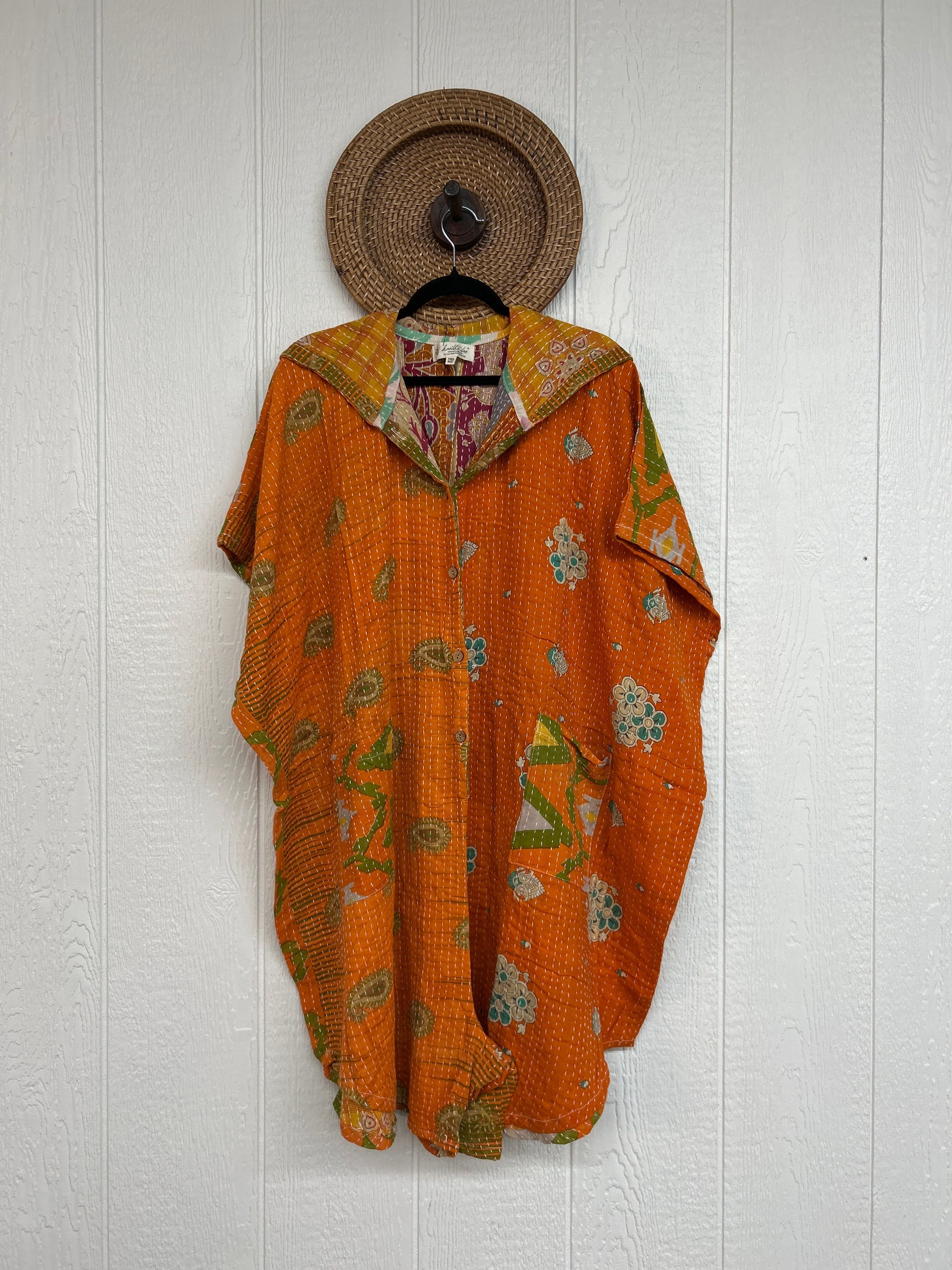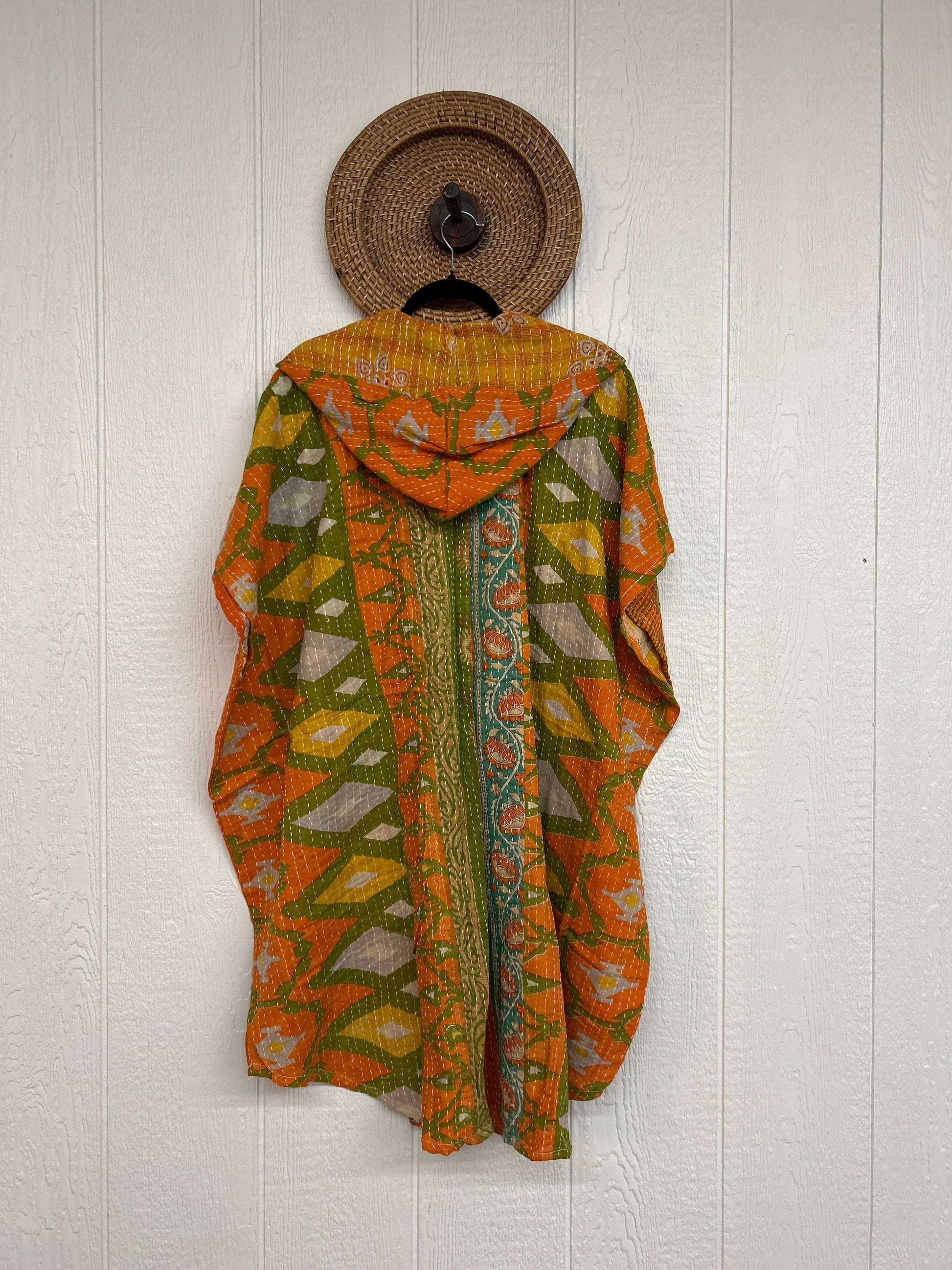 Made from our hand Kantha stitched cotton sari, this one piece wonder features a hood, front button-down closure, pockets, and super flowy shorts. Size Recommended 00-20/22. Crafted and sewn by families in a small village in Northern India, providing work and a fair living.