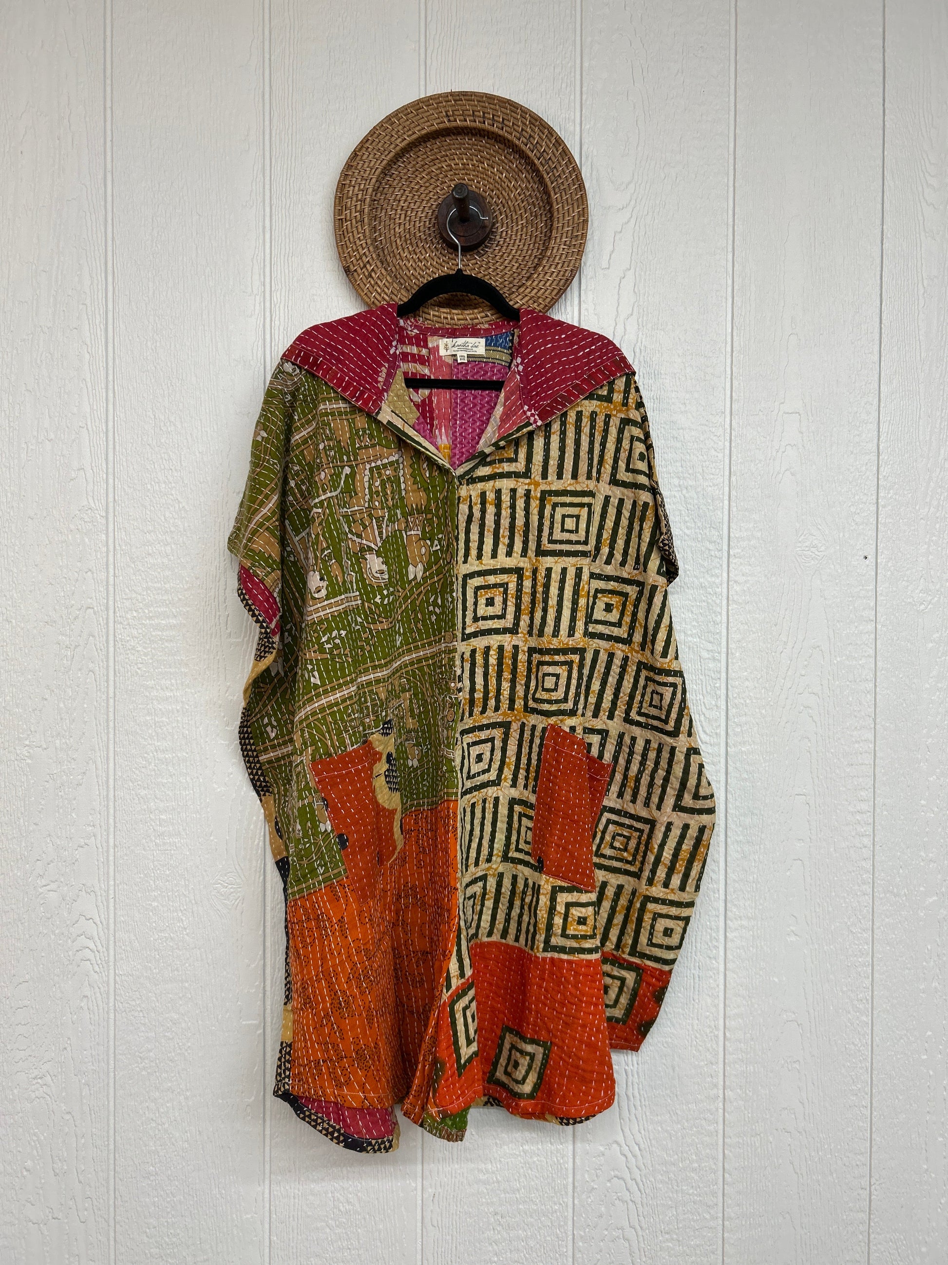 Made from our hand Kantha stitched cotton sari, this one piece wonder features a hood, front button-down closure, pockets, and super flowy shorts. Size Recommended 00-20/22. Crafted and sewn by families in a small village in Northern India, providing work and a fair living.