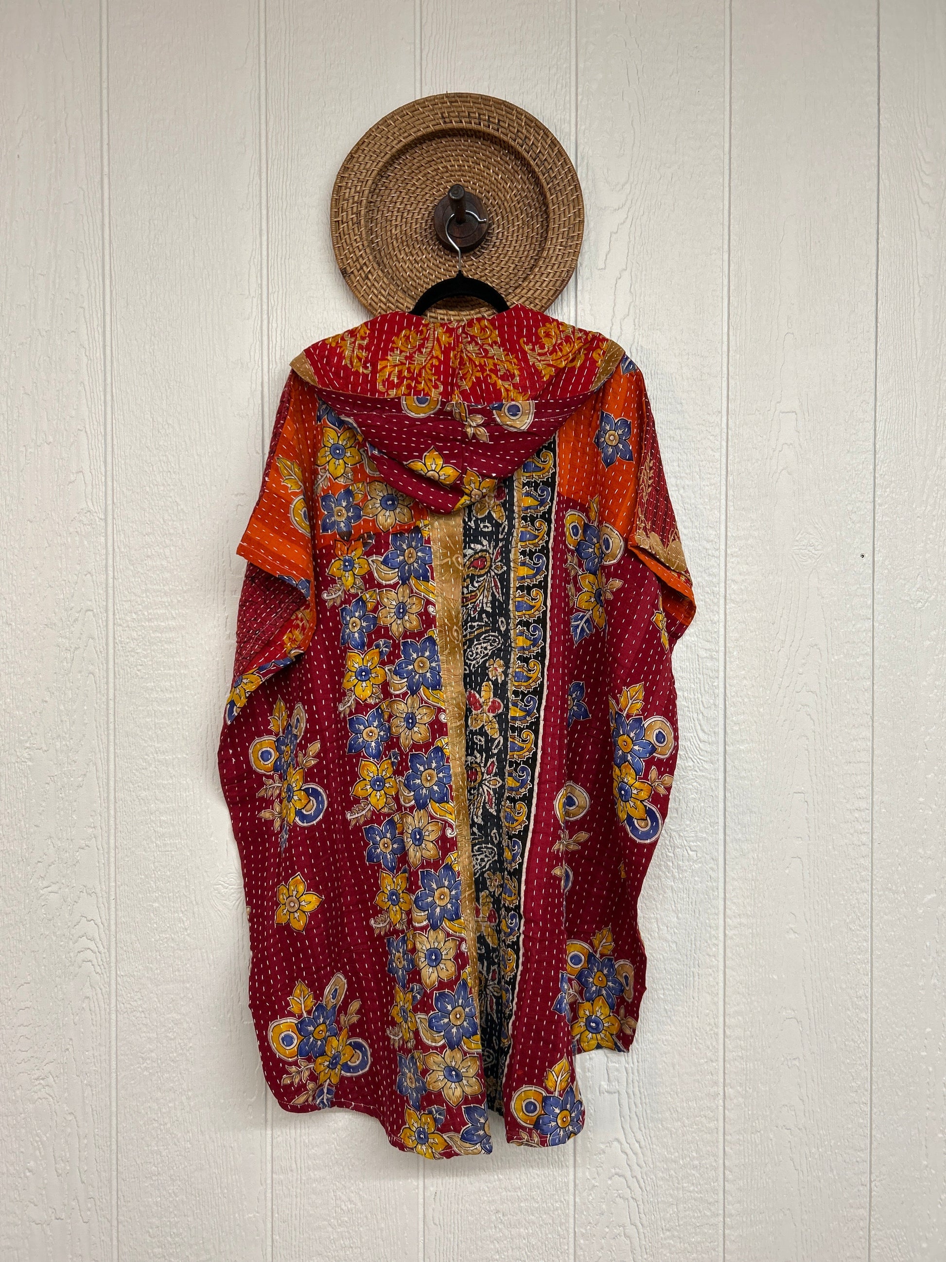 Made from our hand Kantha stitched cotton sari, this one piece wonder features a hood, front button-down closure, pockets, and super flowy shorts. Size Recommended 00-20/22. Crafted and sewn by families in a small village in Northern India, providing work and a fair living.