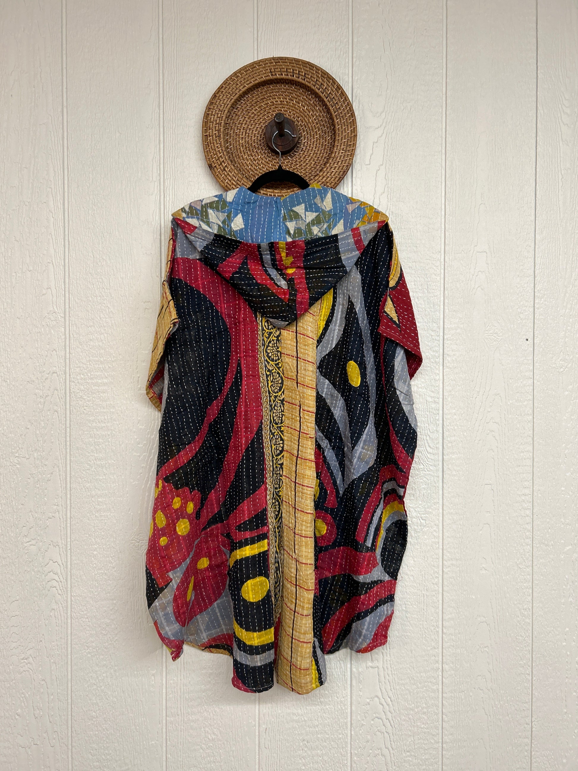 Made from our hand Kantha stitched cotton sari, this one piece wonder features a hood, front button-down closure, pockets, and super flowy shorts. Size Recommended 00-20/22. Crafted and sewn by families in a small village in Northern India, providing work and a fair living.