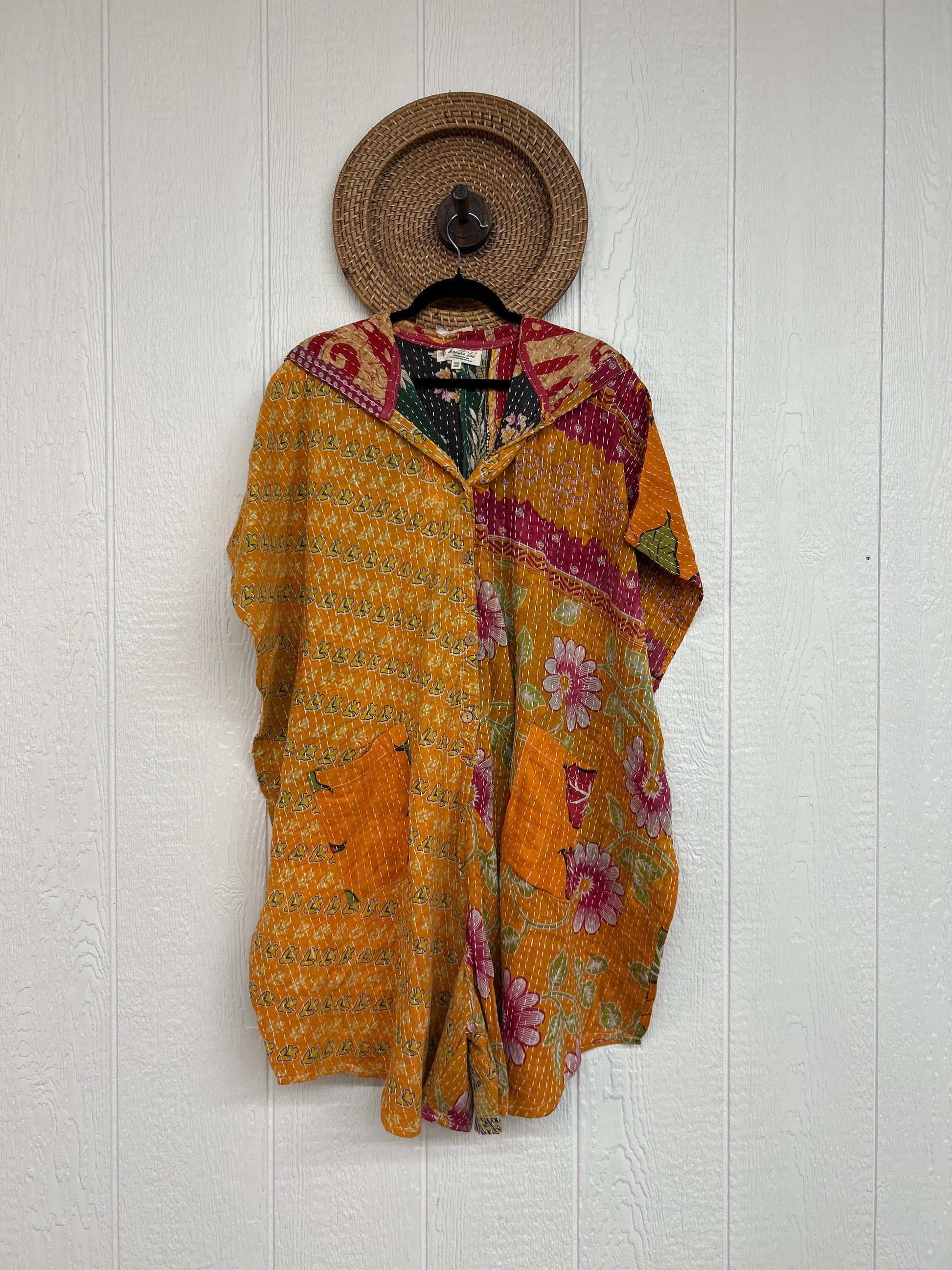 Made from our hand Kantha stitched cotton sari, this one piece wonder features a hood, front button-down closure, pockets, and super flowy shorts. Size Recommended 00-20/22. Crafted and sewn by families in a small village in Northern India, providing work and a fair living.