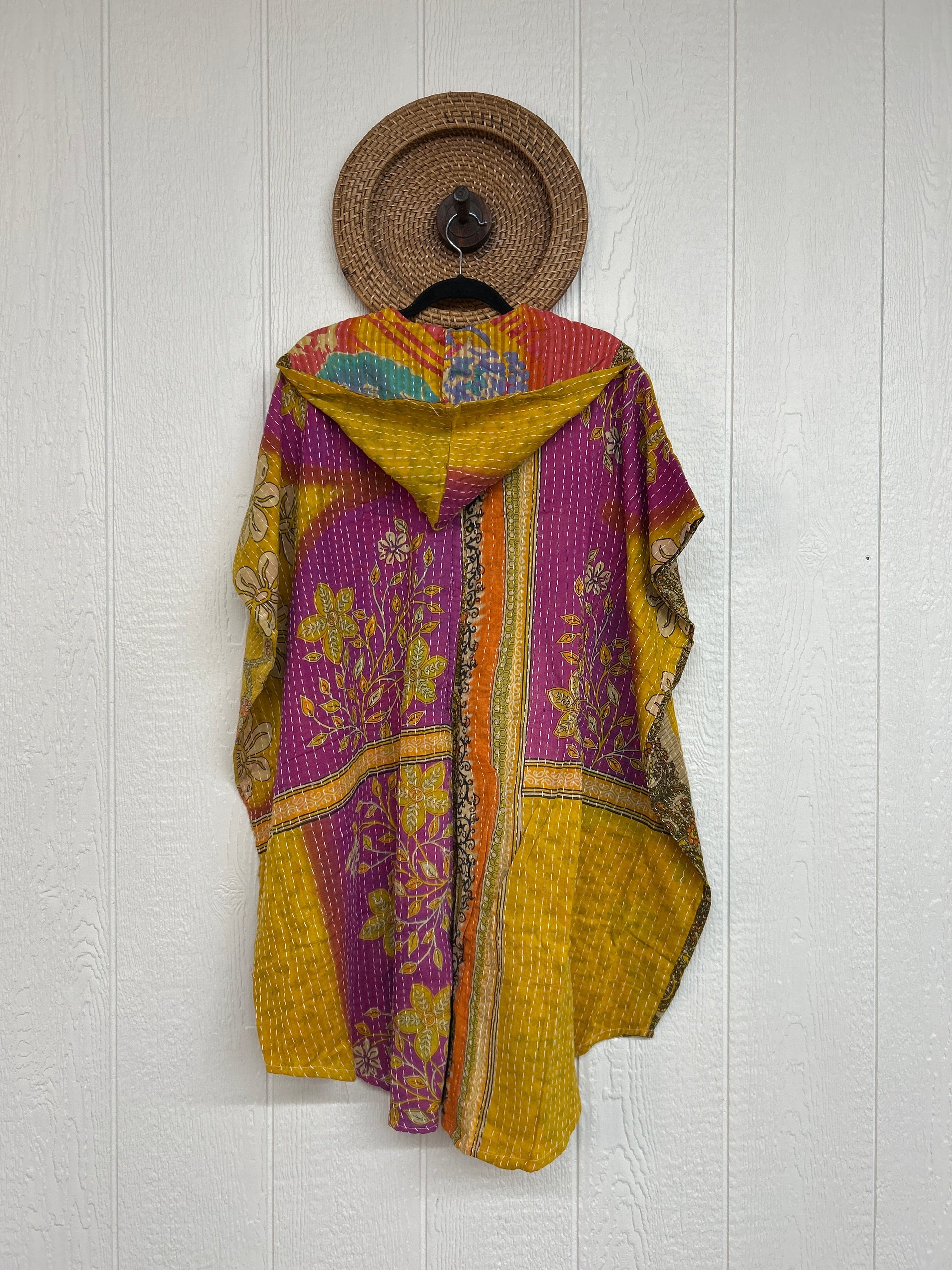 Made from our hand Kantha stitched cotton sari, this one piece wonder features a hood, front button-down closure, pockets, and super flowy shorts. Size Recommended 00-20/22. Crafted and sewn by families in a small village in Northern India, providing work and a fair living.