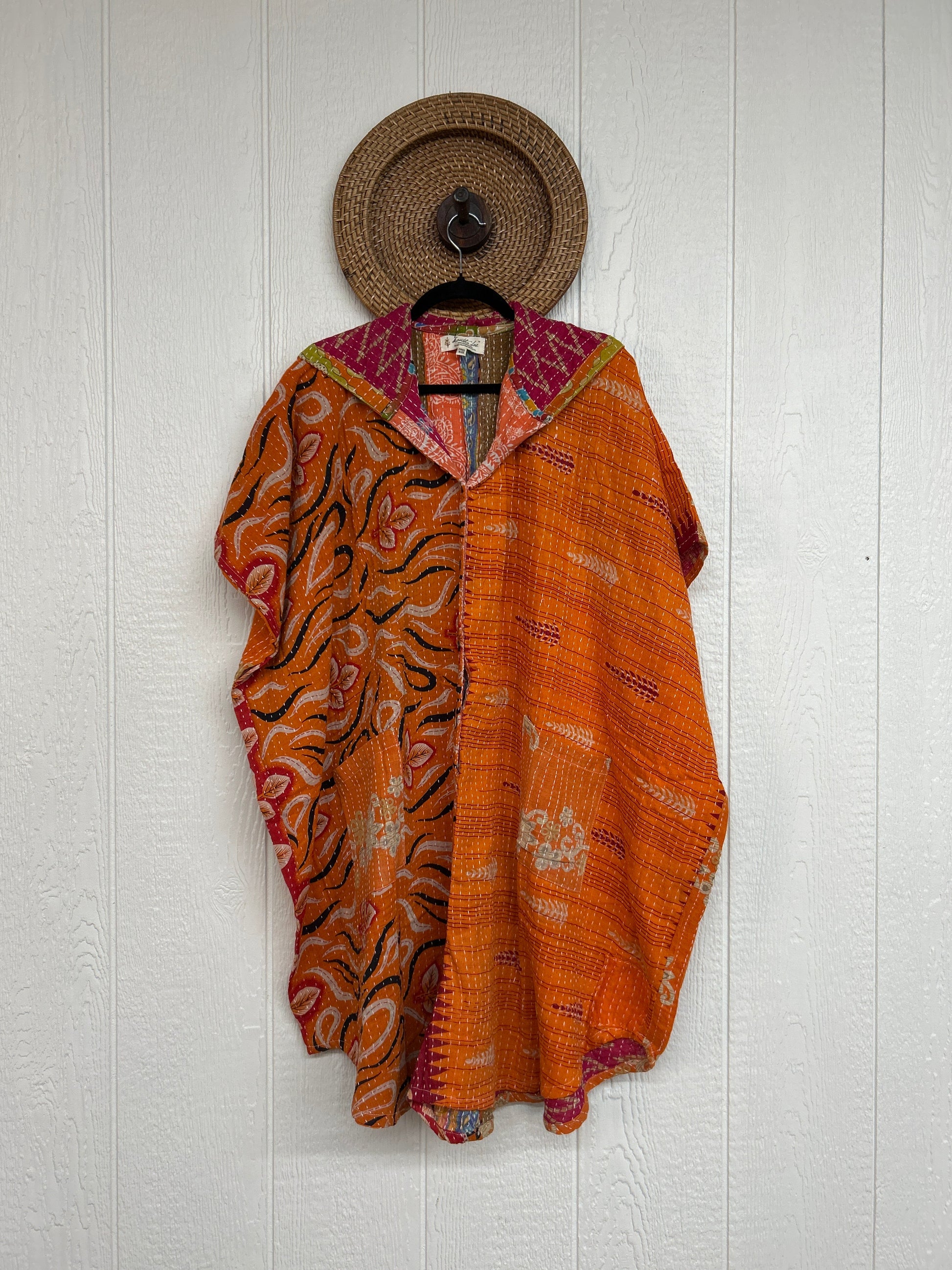 Made from our hand Kantha stitched cotton sari, this one piece wonder features a hood, front button-down closure, pockets, and super flowy shorts. Size Recommended 00-20/22. Crafted and sewn by families in a small village in Northern India, providing work and a fair living.