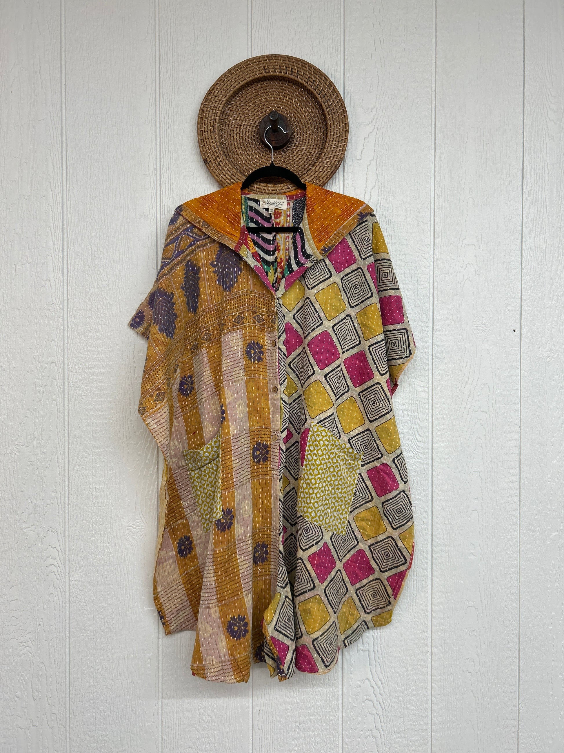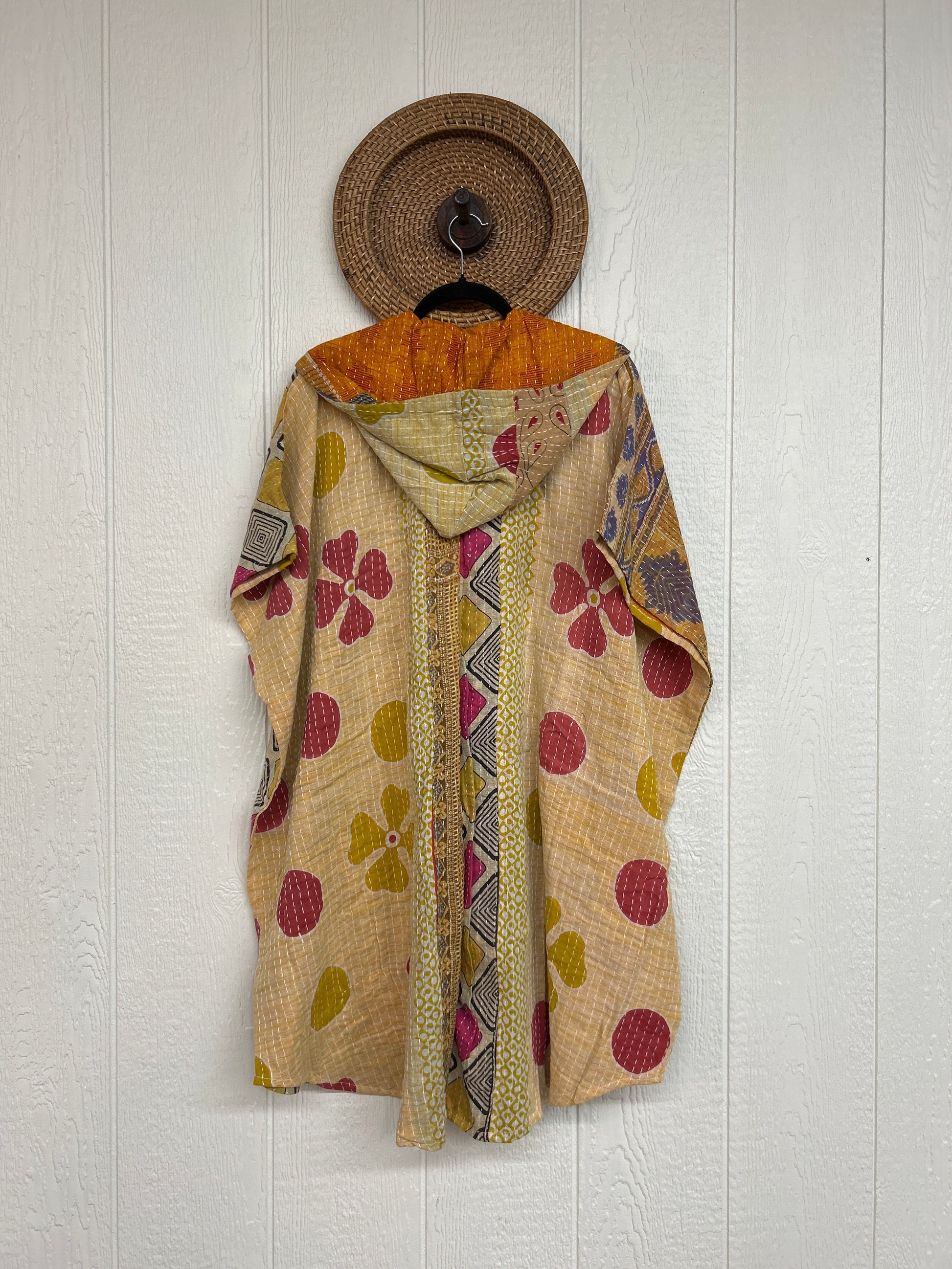 Made from our hand Kantha stitched cotton sari, this one piece wonder features a hood, front button-down closure, pockets, and super flowy shorts. Size Recommended 00-20/22. Crafted and sewn by families in a small village in Northern India, providing work and a fair living.