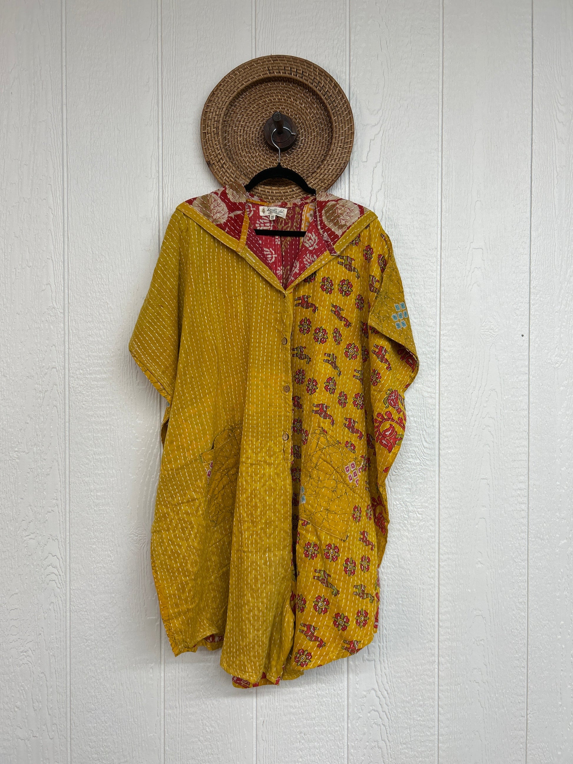 Made from our hand Kantha stitched cotton sari, this one piece wonder features a hood, front button-down closure, pockets, and super flowy shorts. Size Recommended 00-20/22. Crafted and sewn by families in a small village in Northern India, providing work and a fair living.