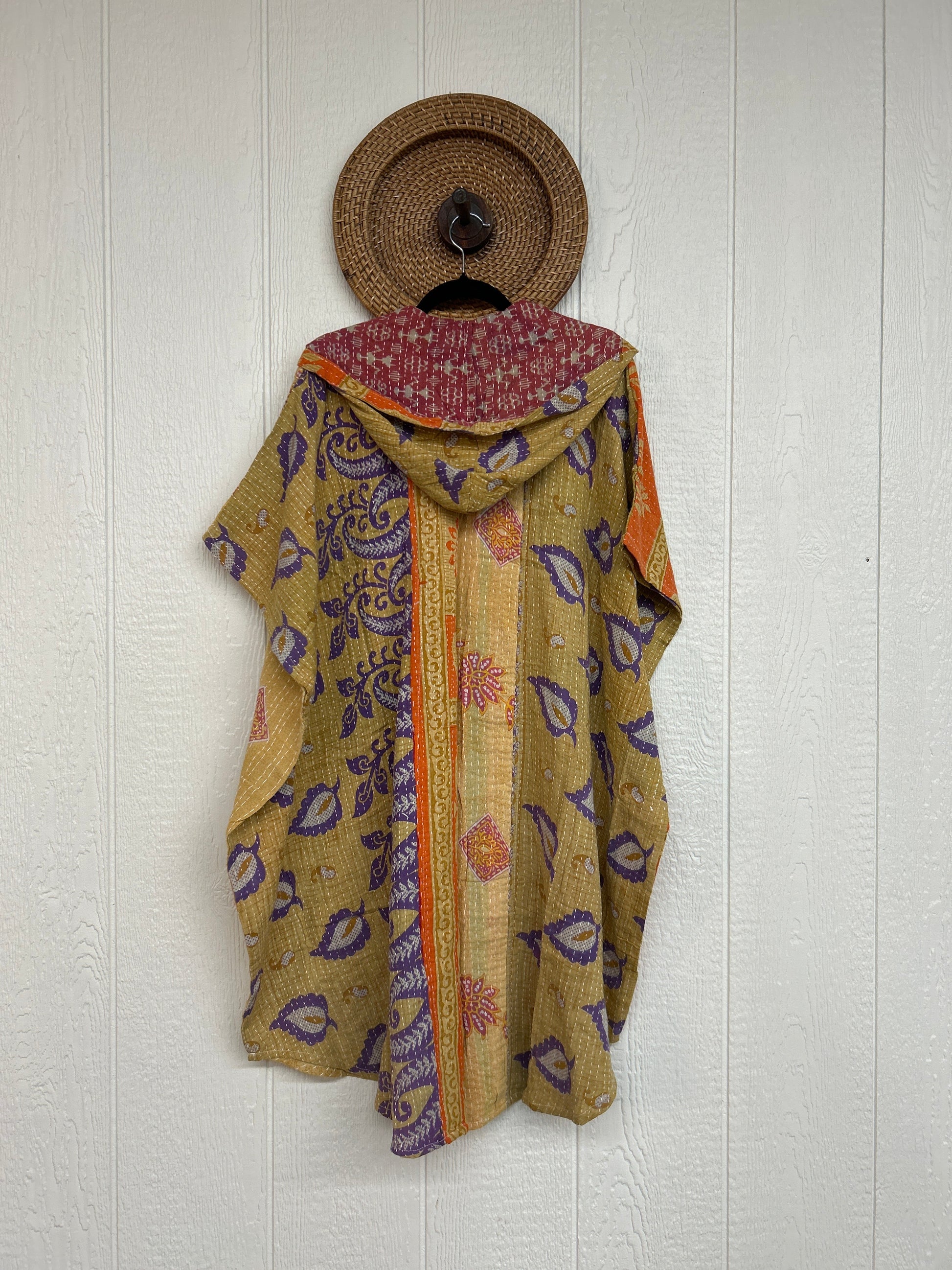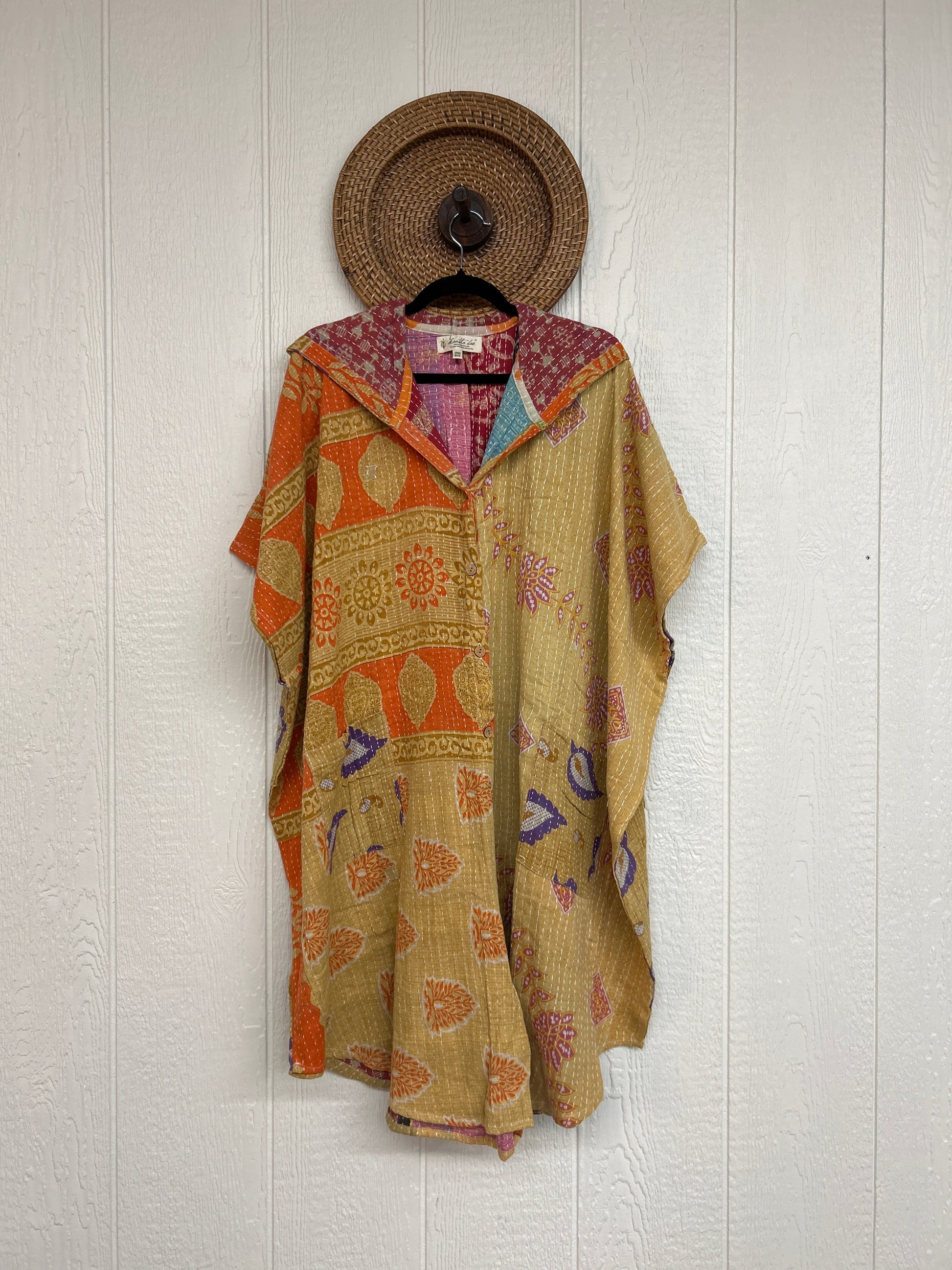 Made from our hand Kantha stitched cotton sari, this one piece wonder features a hood, front button-down closure, pockets, and super flowy shorts. Size Recommended 00-20/22. Crafted and sewn by families in a small village in Northern India, providing work and a fair living.