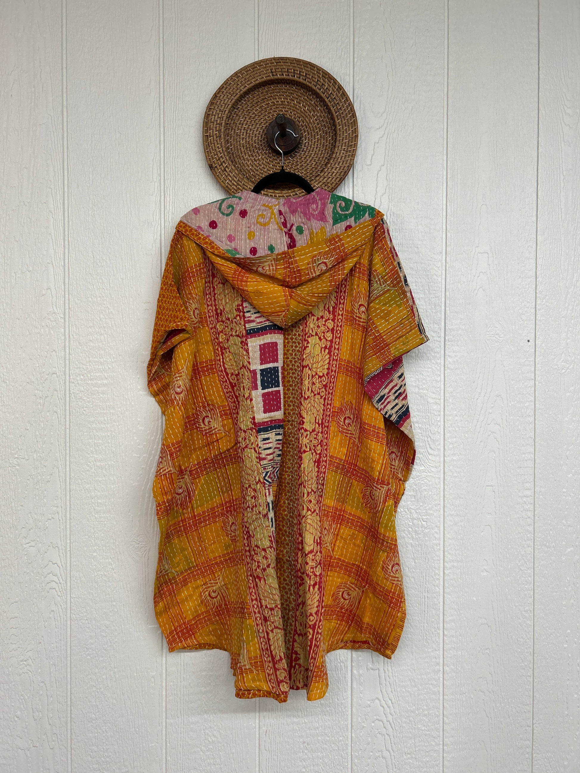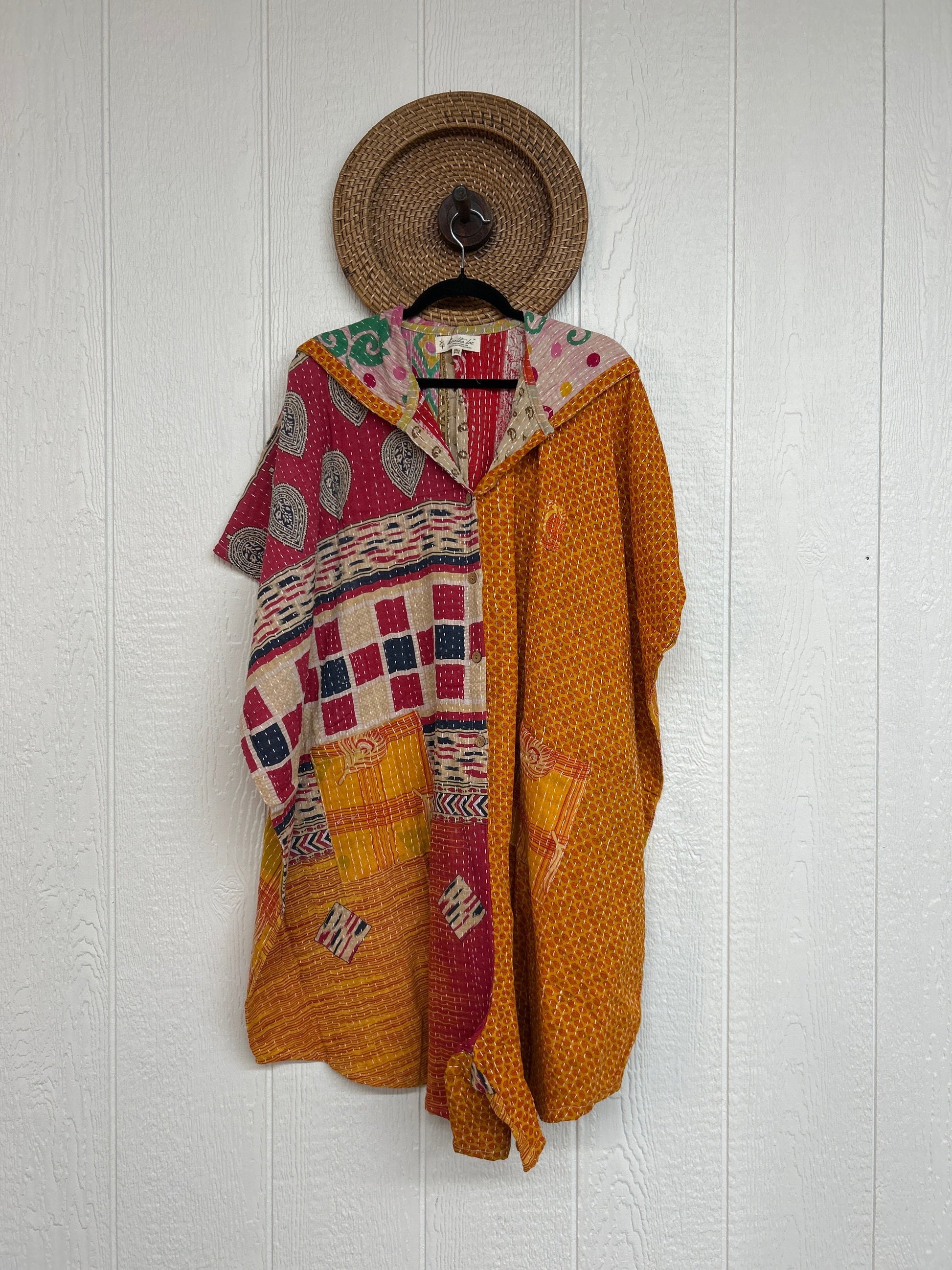 Made from our hand Kantha stitched cotton sari, this one piece wonder features a hood, front button-down closure, pockets, and super flowy shorts. Size Recommended 00-20/22. Crafted and sewn by families in a small village in Northern India, providing work and a fair living.