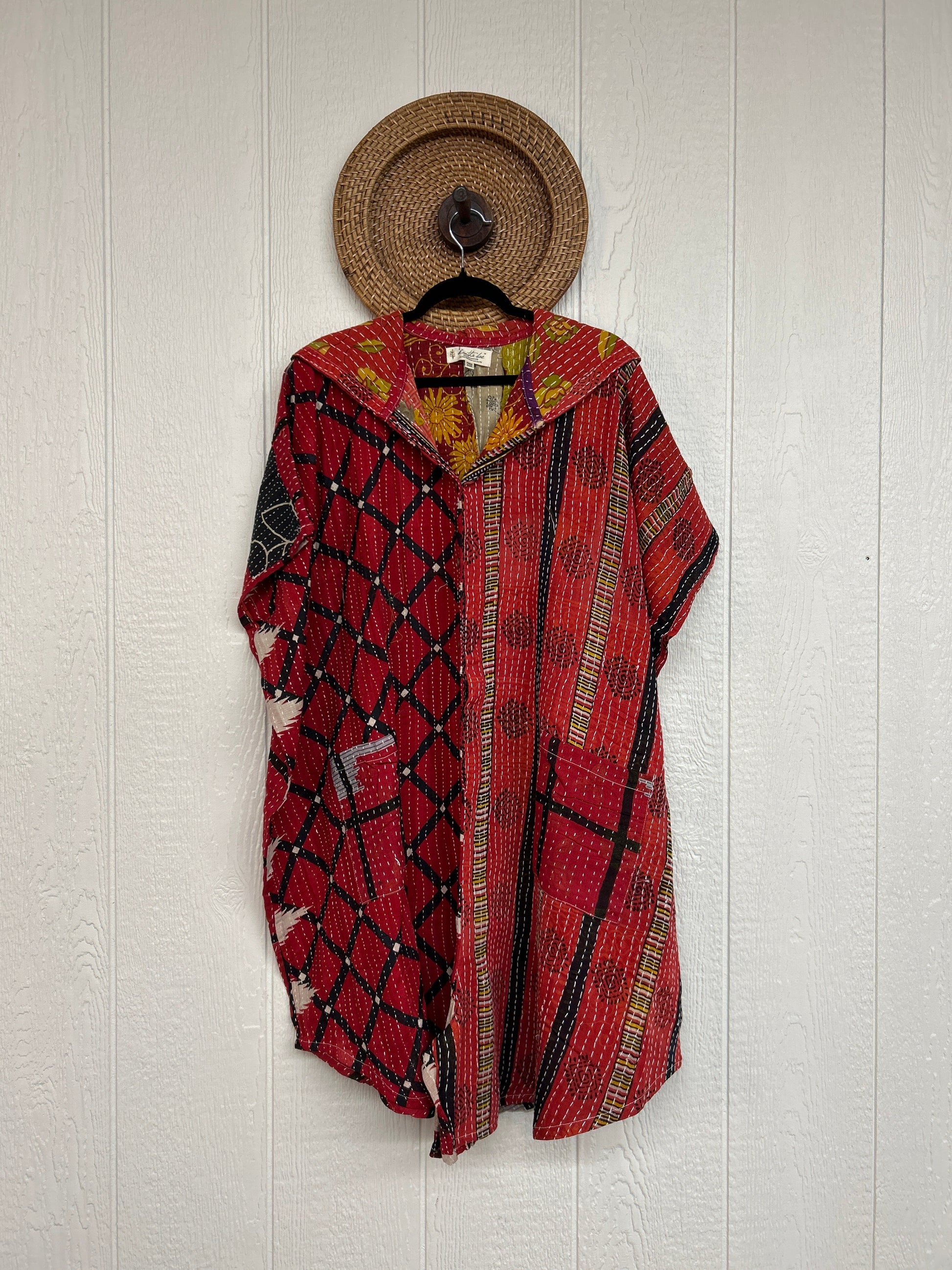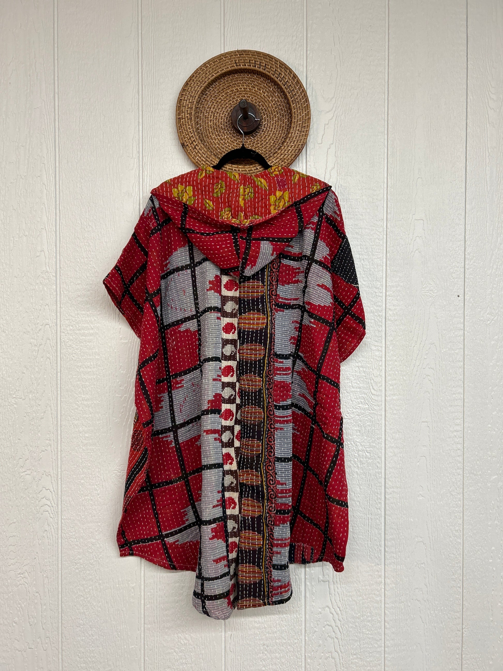 Made from our hand Kantha stitched cotton sari, this one piece wonder features a hood, front button-down closure, pockets, and super flowy shorts. Size Recommended 00-20/22. Crafted and sewn by families in a small village in Northern India, providing work and a fair living.