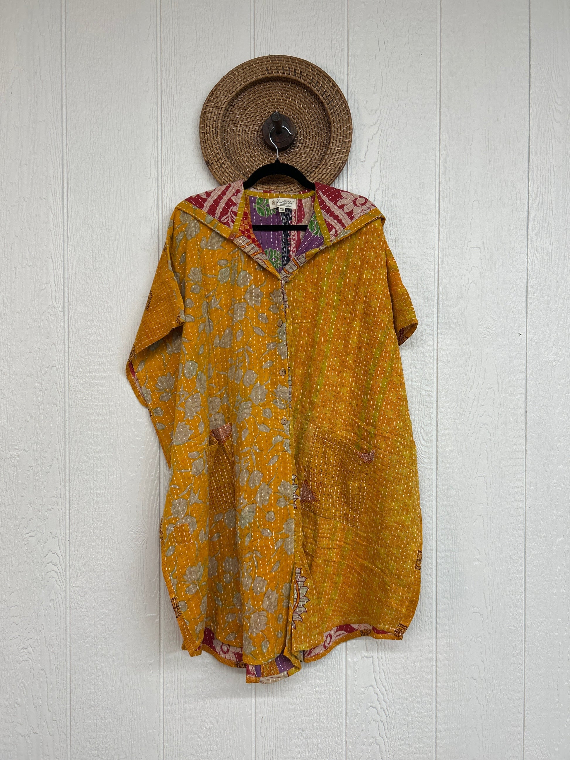 Made from our hand Kantha stitched cotton sari, this one piece wonder features a hood, front button-down closure, pockets, and super flowy shorts. Size Recommended 00-20/22. Crafted and sewn by families in a small village in Northern India, providing work and a fair living.
