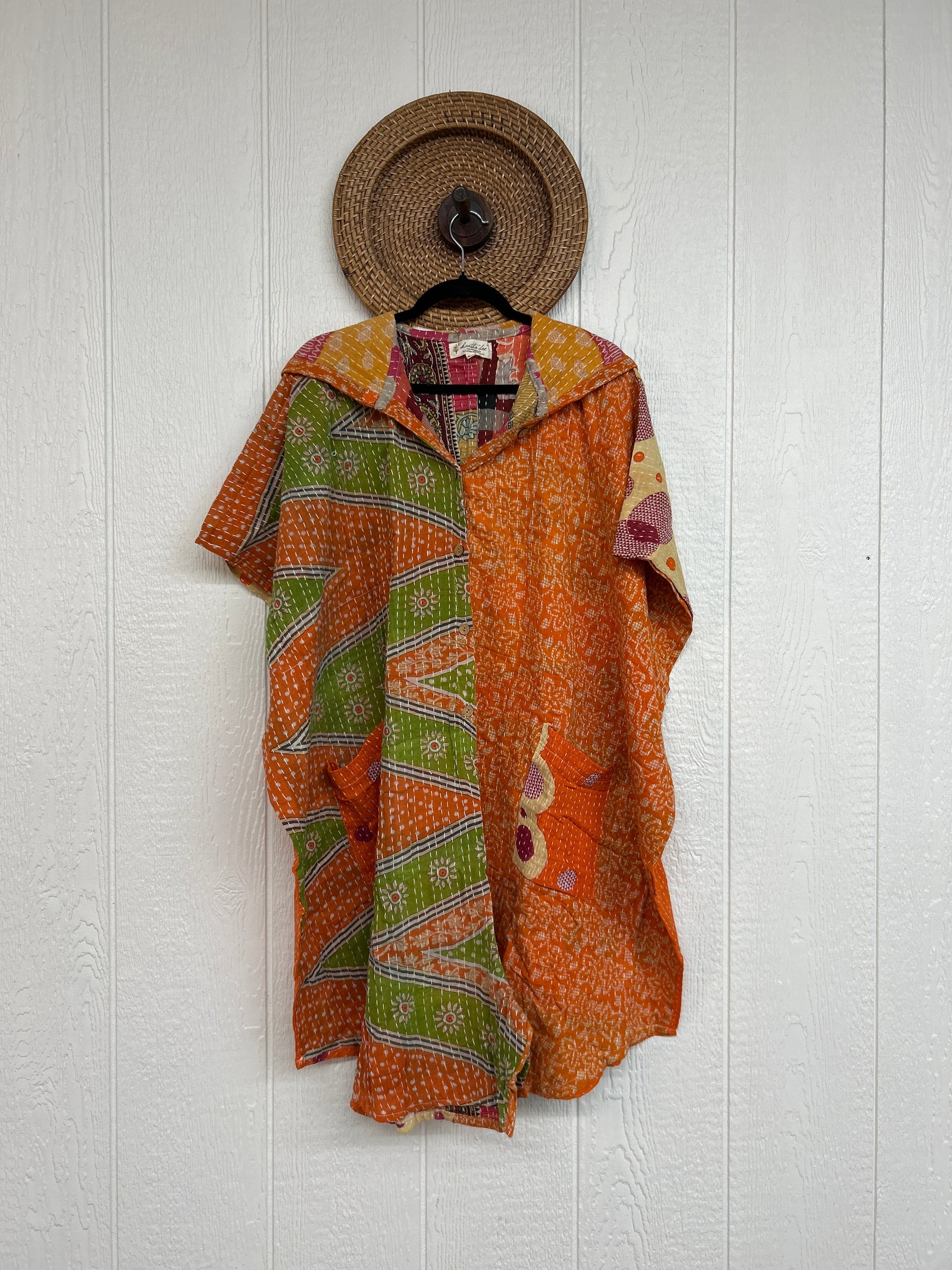 Made from our hand Kantha stitched cotton sari, this one piece wonder features a hood, front button-down closure, pockets, and super flowy shorts. Size Recommended 00-20/22. Crafted and sewn by families in a small village in Northern India, providing work and a fair living.