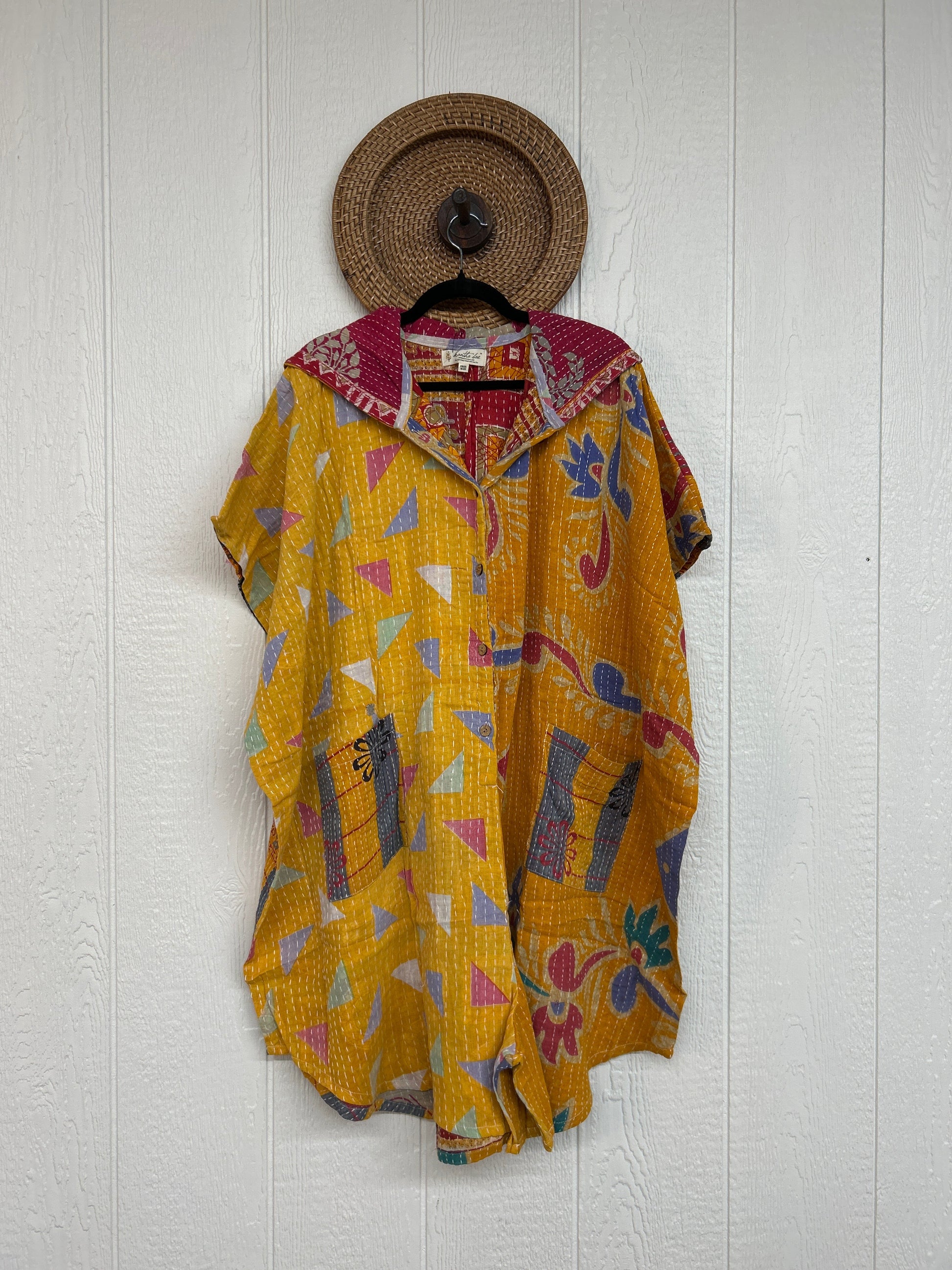 Made from our hand Kantha stitched cotton sari, this one piece wonder features a hood, front button-down closure, pockets, and super flowy shorts. Size Recommended 00-20/22. Crafted and sewn by families in a small village in Northern India, providing work and a fair living.