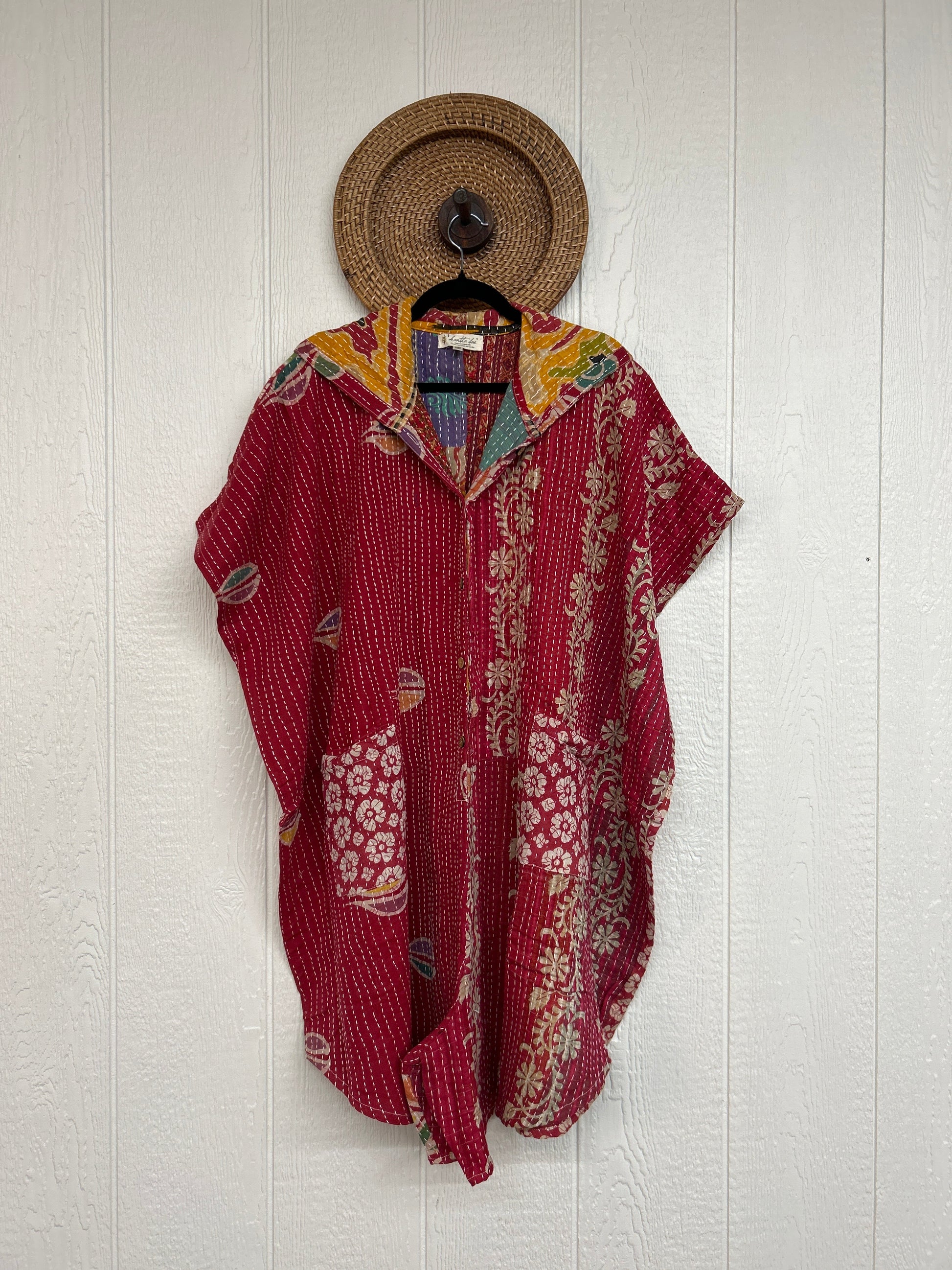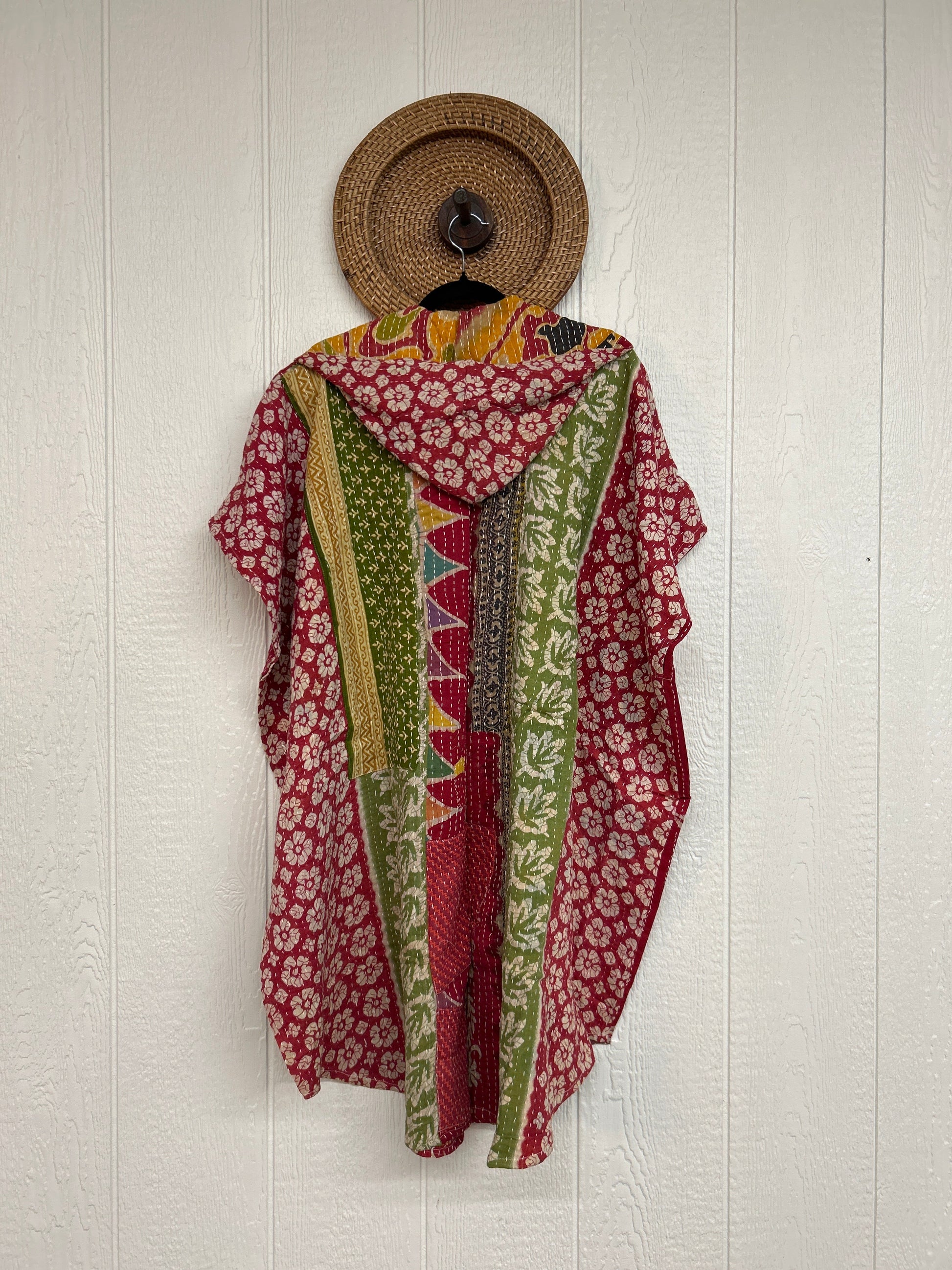 Made from our hand Kantha stitched cotton sari, this one piece wonder features a hood, front button-down closure, pockets, and super flowy shorts. Size Recommended 00-20/22. Crafted and sewn by families in a small village in Northern India, providing work and a fair living.