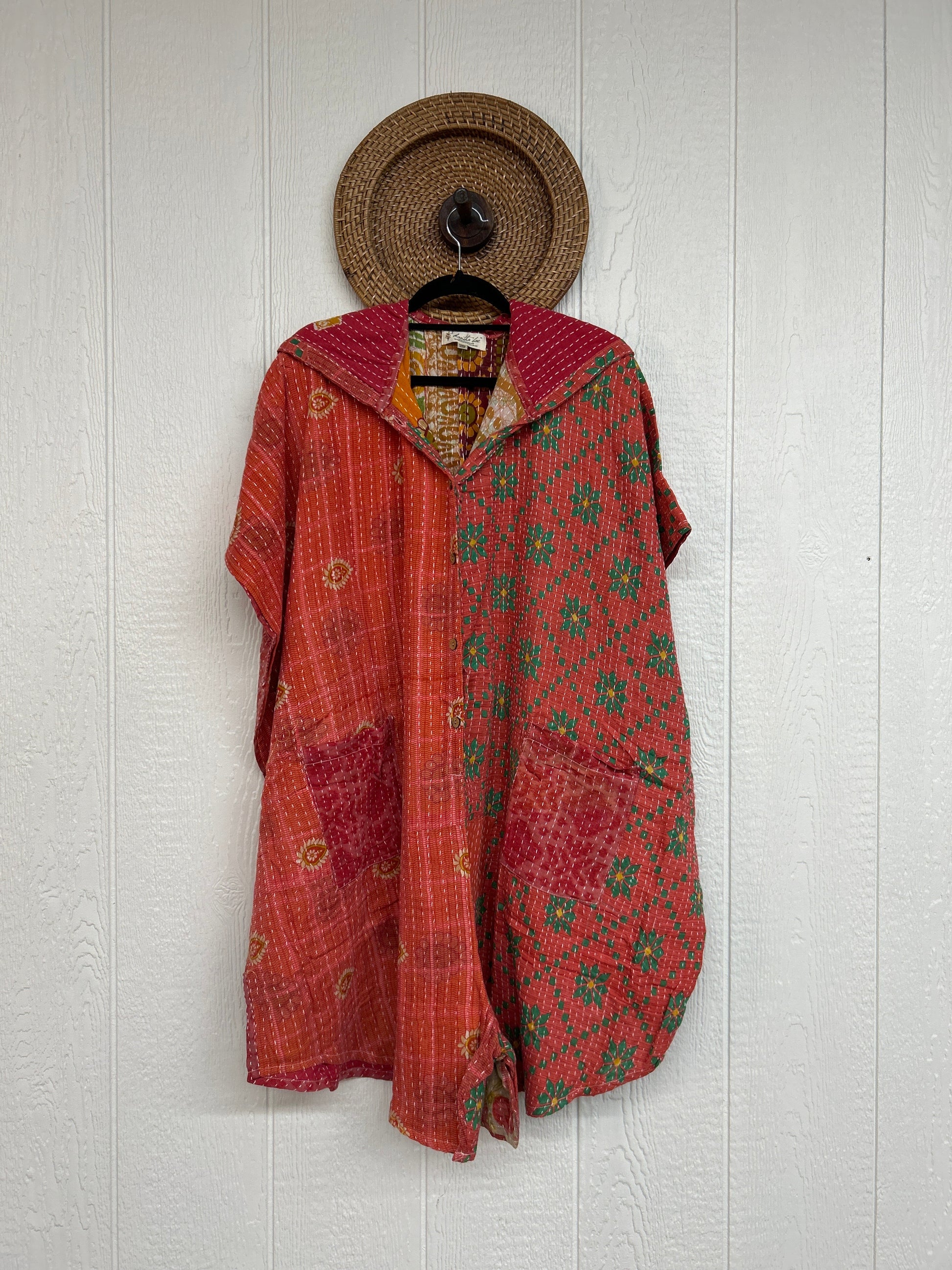 Made from our hand Kantha stitched cotton sari, this one piece wonder features a hood, front button-down closure, pockets, and super flowy shorts. Size Recommended 00-20/22. Crafted and sewn by families in a small village in Northern India, providing work and a fair living.