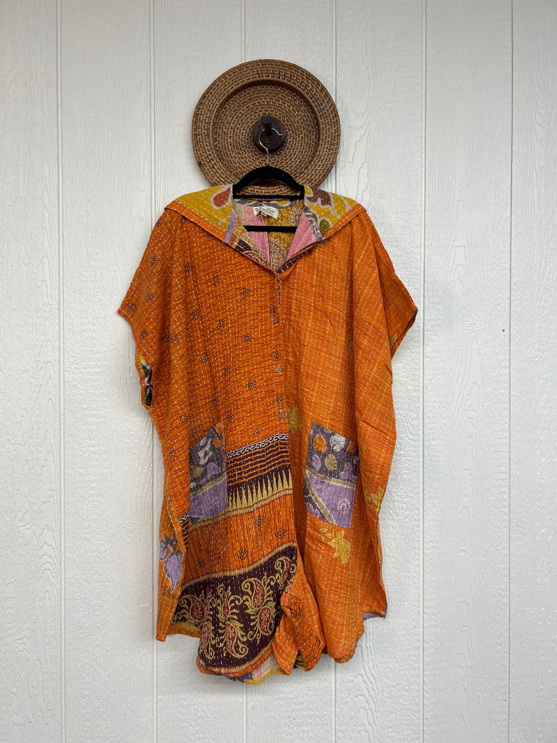 Made from our hand Kantha stitched cotton sari, this one piece wonder features a hood, front button-down closure, pockets, and super flowy shorts. Size Recommended 00-20/22. Crafted and sewn by families in a small village in Northern India, providing work and a fair living.