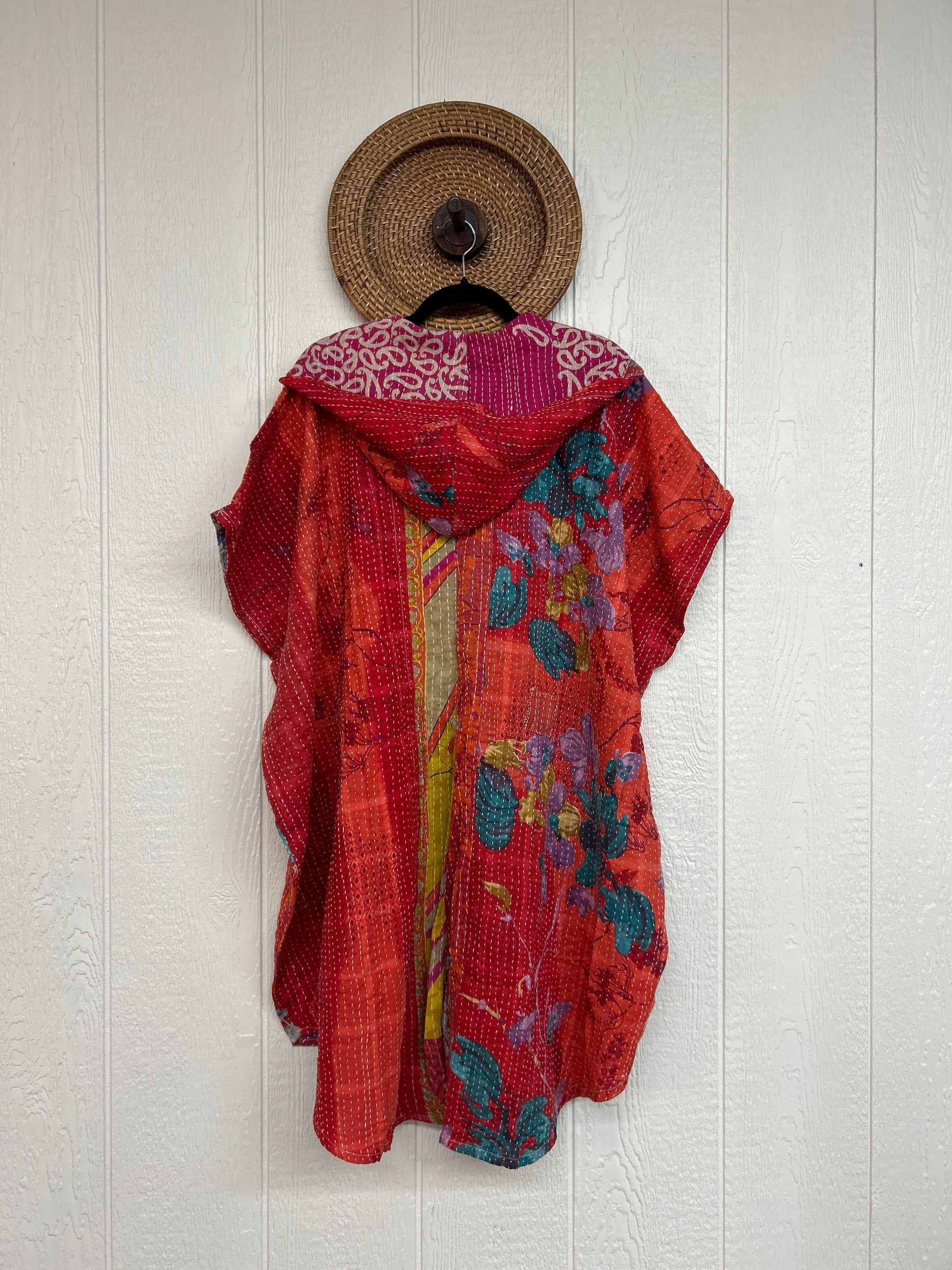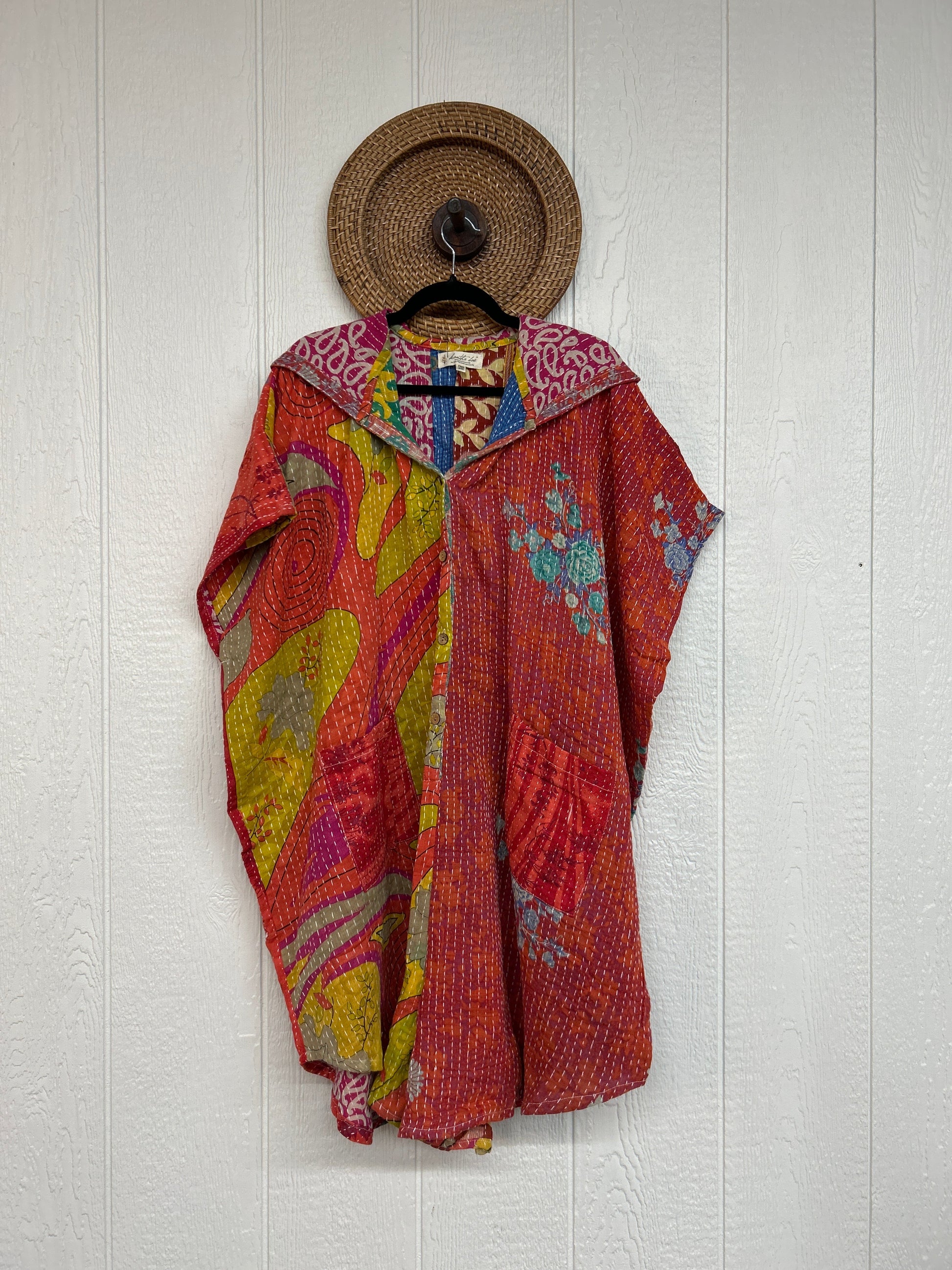 Made from our hand Kantha stitched cotton sari, this one piece wonder features a hood, front button-down closure, pockets, and super flowy shorts. Size Recommended 00-20/22. Crafted and sewn by families in a small village in Northern India, providing work and a fair living.