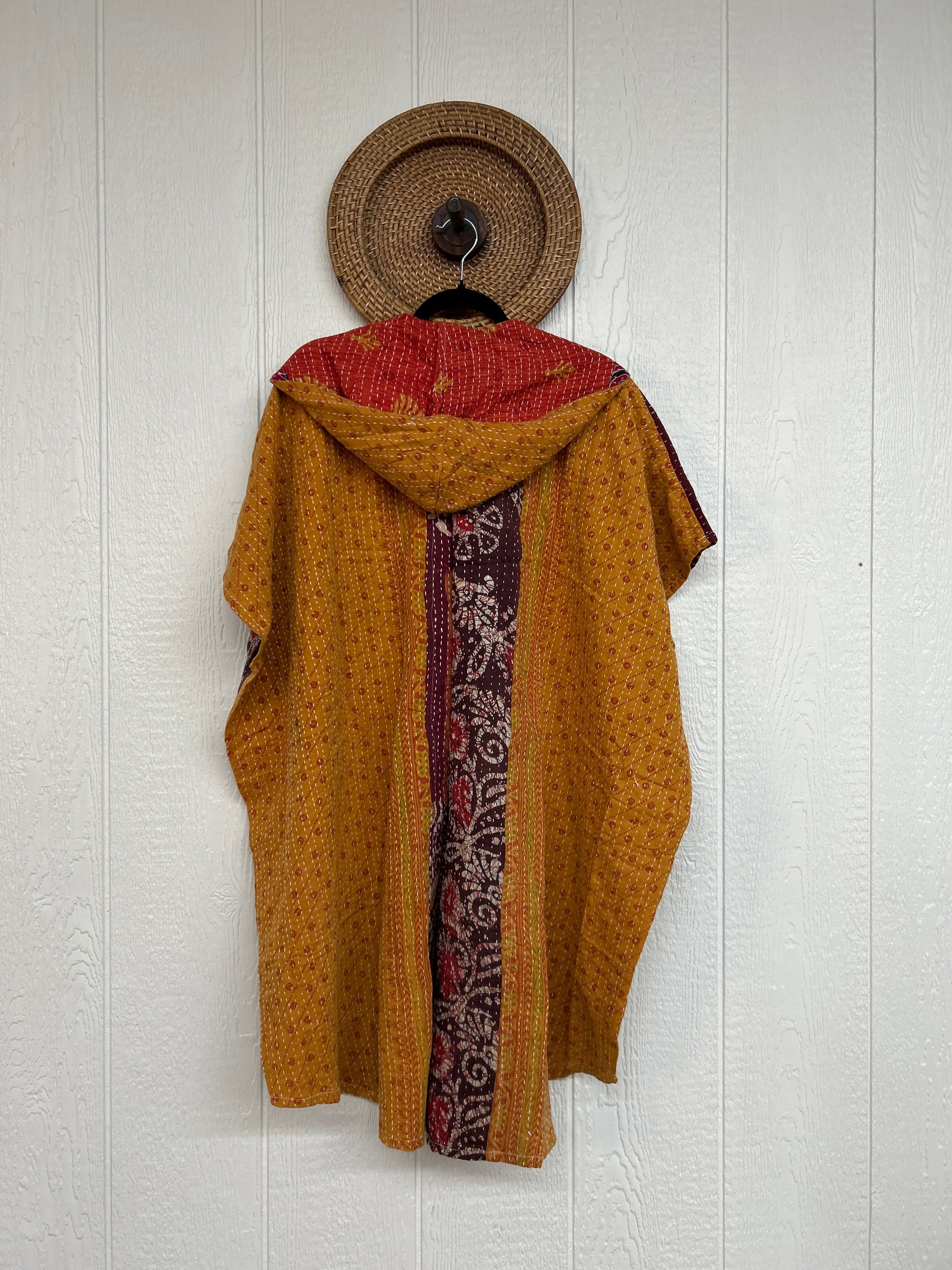 Made from our hand Kantha stitched cotton sari, this one piece wonder features a hood, front button-down closure, pockets, and super flowy shorts. Size Recommended 00-20/22. Crafted and sewn by families in a small village in Northern India, providing work and a fair living.