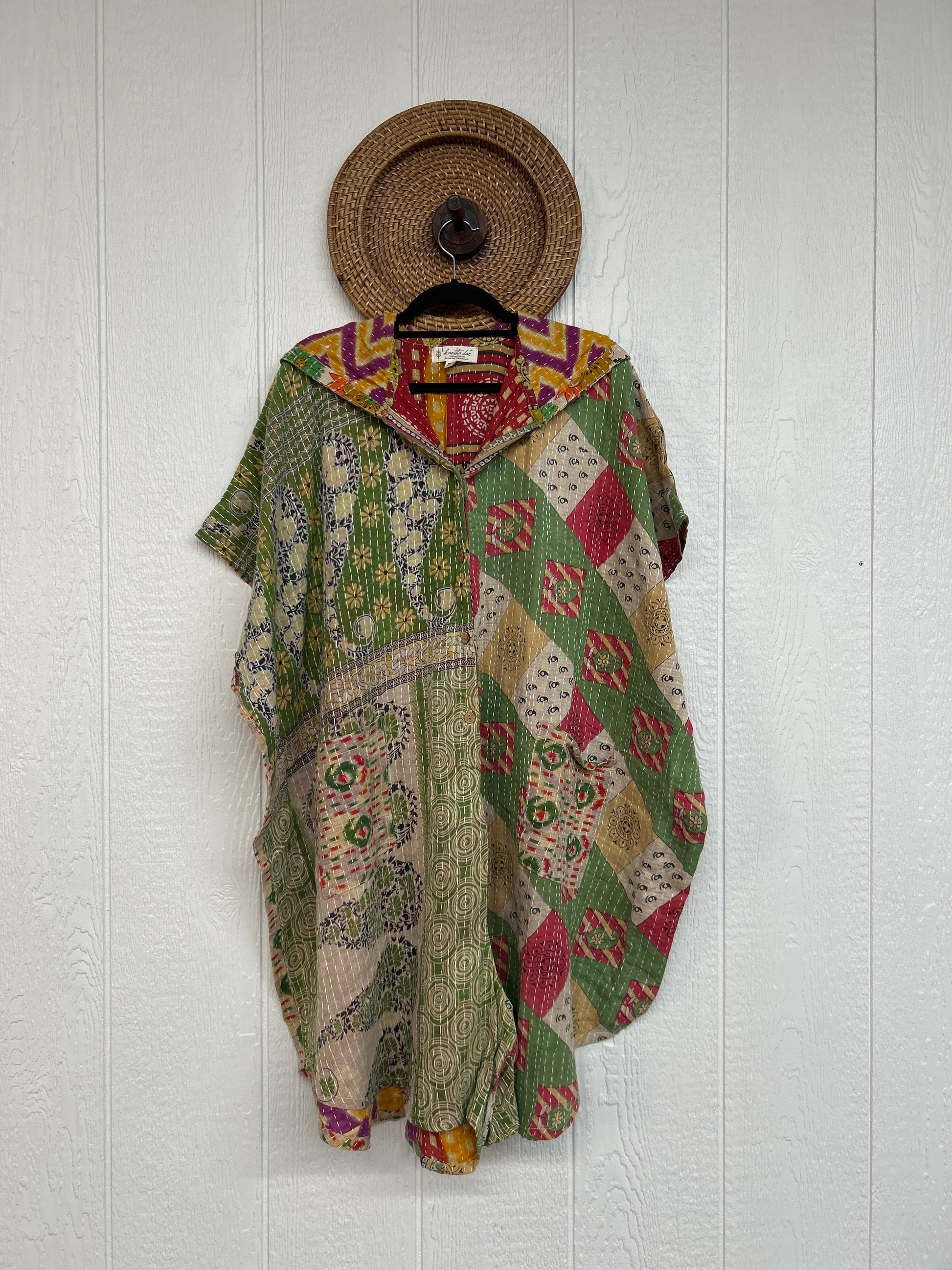 Made from our hand Kantha stitched cotton sari, this one piece wonder features a hood, front button-down closure, pockets, and super flowy shorts. Size Recommended 00-20/22. Crafted and sewn by families in a small village in Northern India, providing work and a fair living.