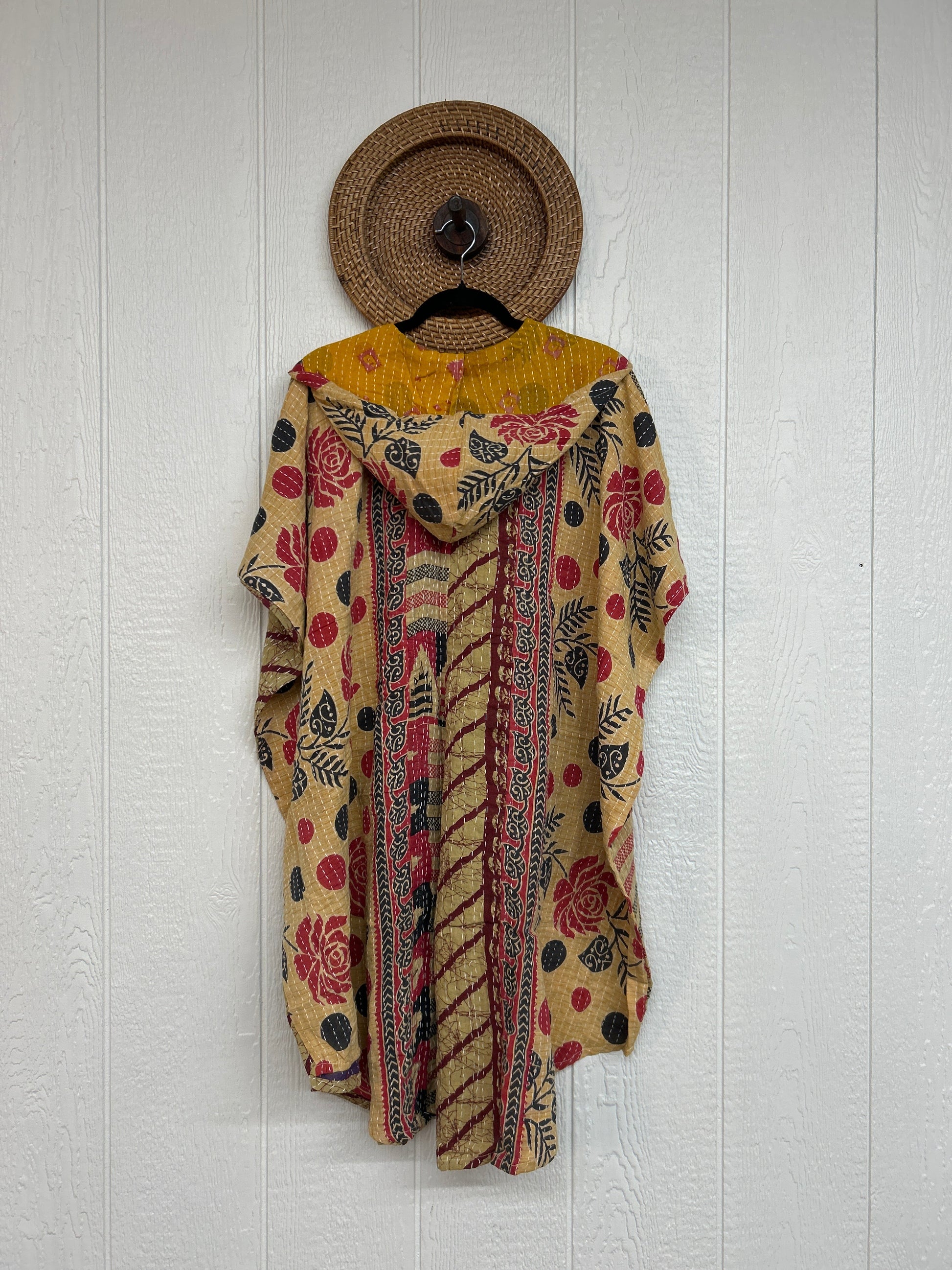 Made from our hand Kantha stitched cotton sari, this one piece wonder features a hood, front button-down closure, pockets, and super flowy shorts. Size Recommended 00-20/22. Crafted and sewn by families in a small village in Northern India, providing work and a fair living.
