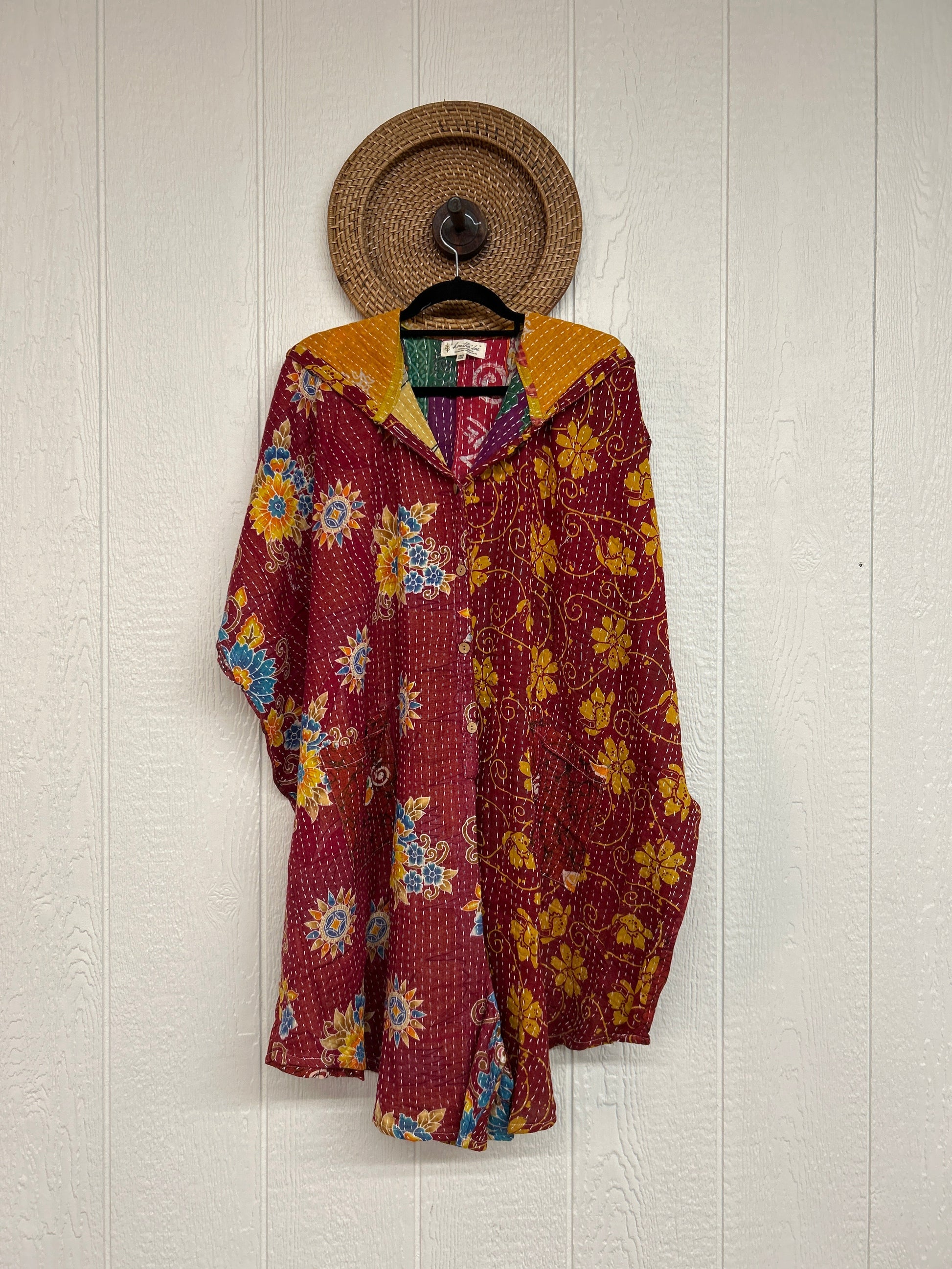 Made from our hand Kantha stitched cotton sari, this one piece wonder features a hood, front button-down closure, pockets, and super flowy shorts. Size Recommended 00-20/22. Crafted and sewn by families in a small village in Northern India, providing work and a fair living.