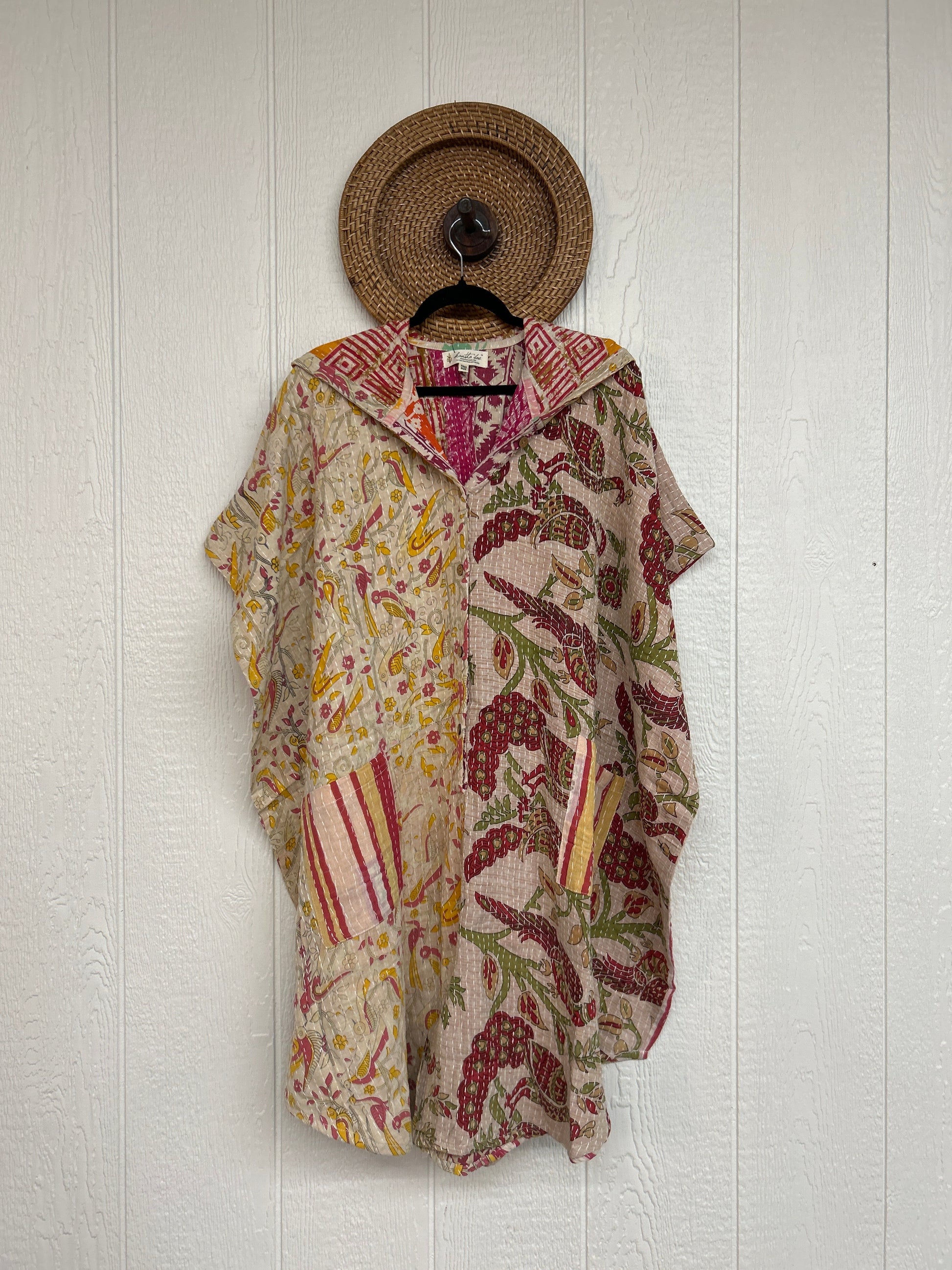 Made from our hand Kantha stitched cotton sari, this one piece wonder features a hood, front button-down closure, pockets, and super flowy shorts. Size Recommended 00-20/22. Crafted and sewn by families in a small village in Northern India, providing work and a fair living.