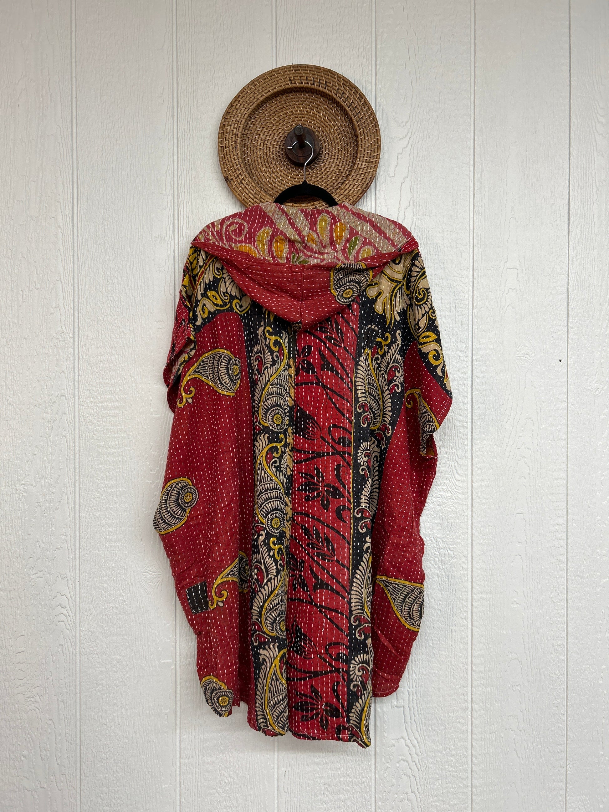 Made from our hand Kantha stitched cotton sari, this one piece wonder features a hood, front button-down closure, pockets, and super flowy shorts. Size Recommended 00-20/22. Crafted and sewn by families in a small village in Northern India, providing work and a fair living.