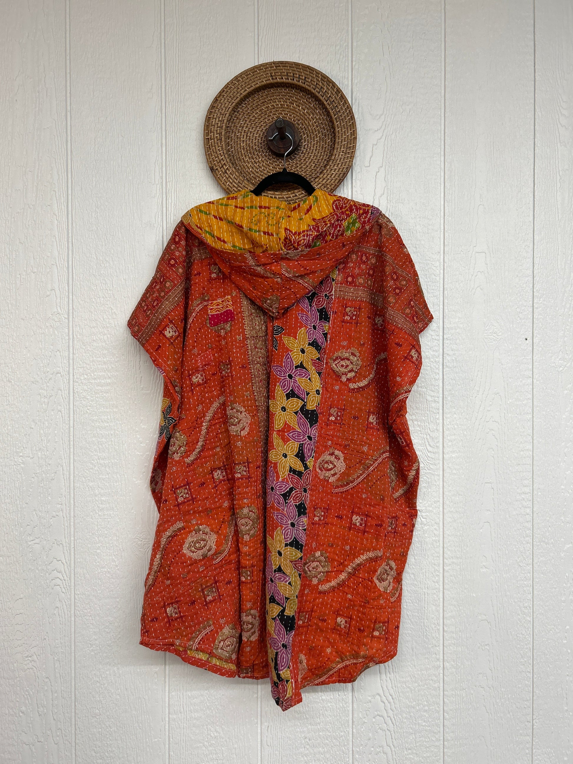 Made from our hand Kantha stitched cotton sari, this one piece wonder features a hood, front button-down closure, pockets, and super flowy shorts. Size Recommended 00-20/22. Crafted and sewn by families in a small village in Northern India, providing work and a fair living.
