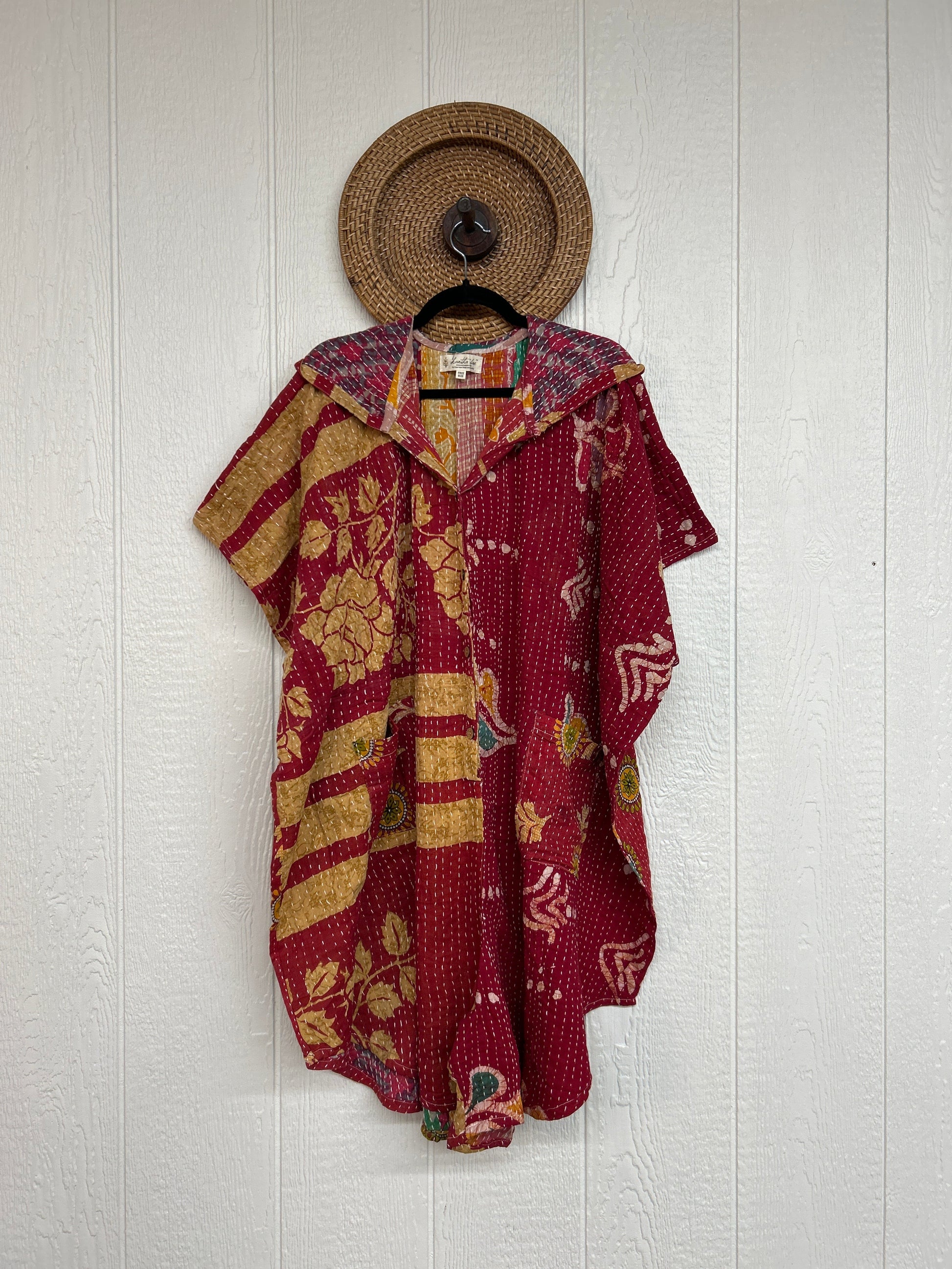 Made from our hand Kantha stitched cotton sari, this one piece wonder features a hood, front button-down closure, pockets, and super flowy shorts. Size Recommended 00-20/22. Crafted and sewn by families in a small village in Northern India, providing work and a fair living.