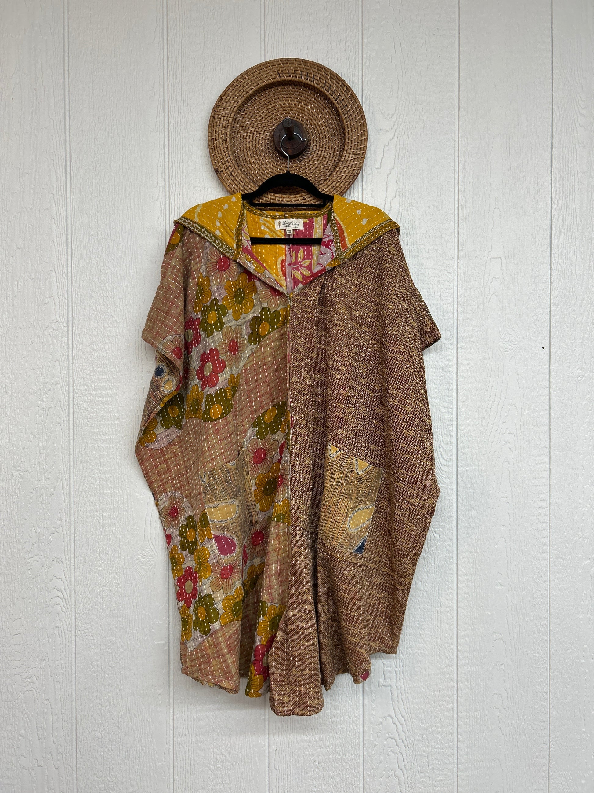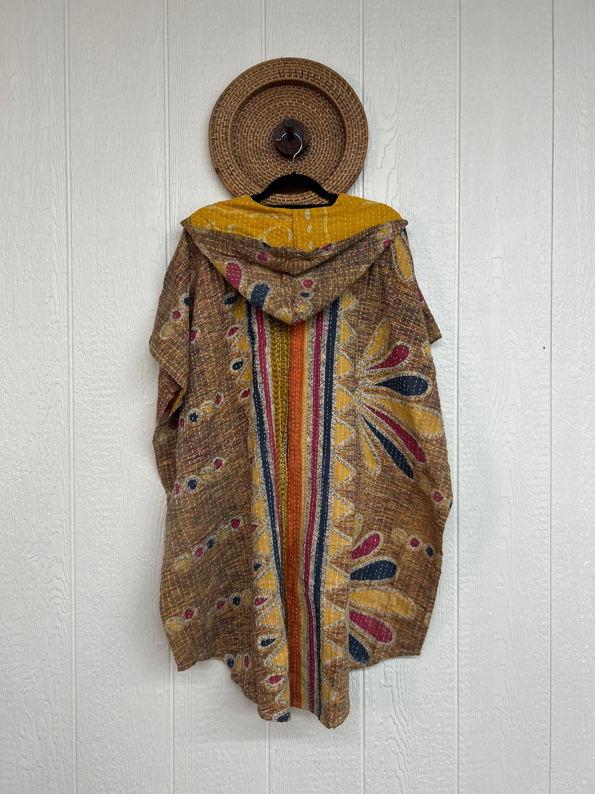 Made from our hand Kantha stitched cotton sari, this one piece wonder features a hood, front button-down closure, pockets, and super flowy shorts. Size Recommended 00-20/22. Crafted and sewn by families in a small village in Northern India, providing work and a fair living.