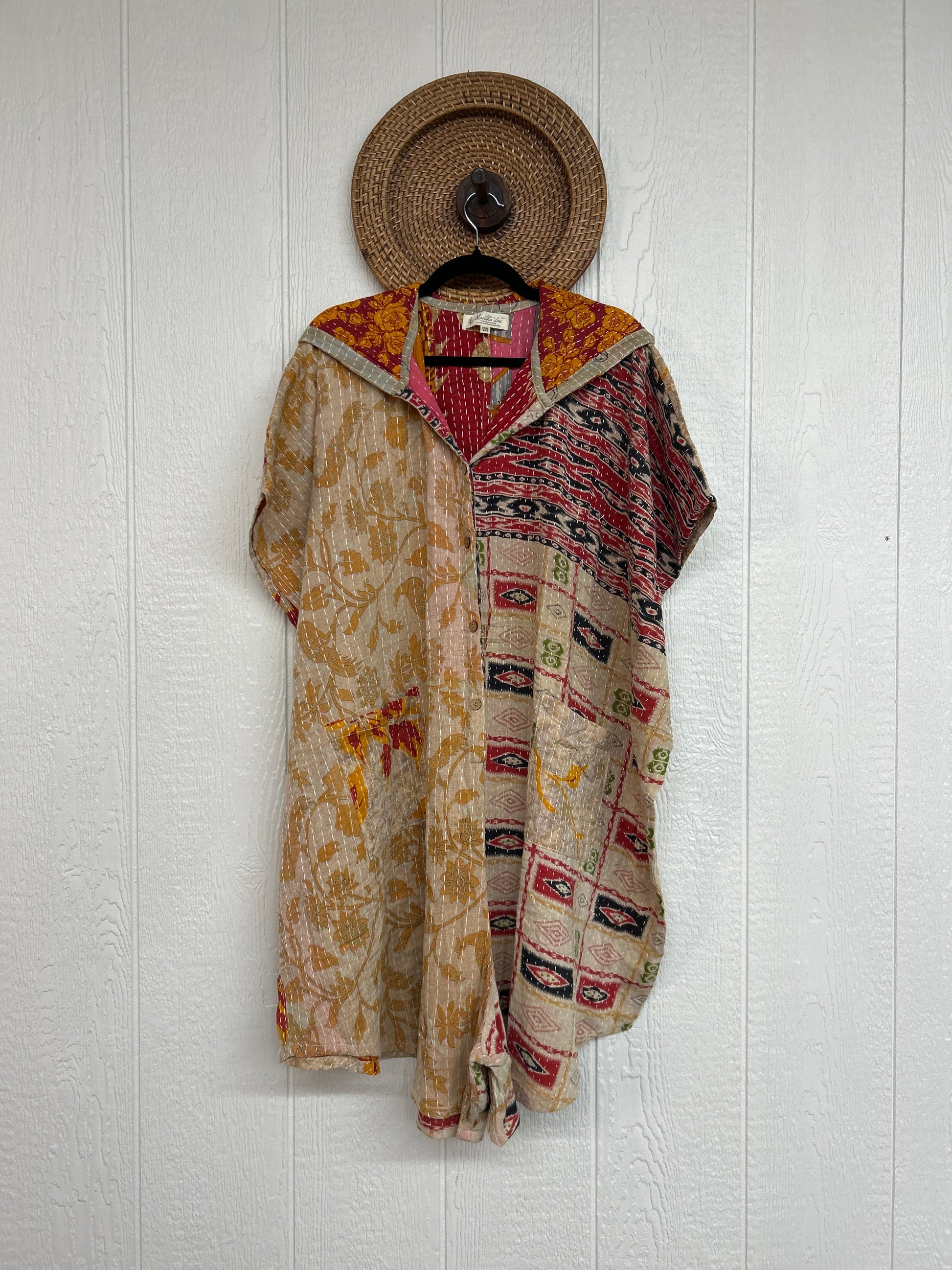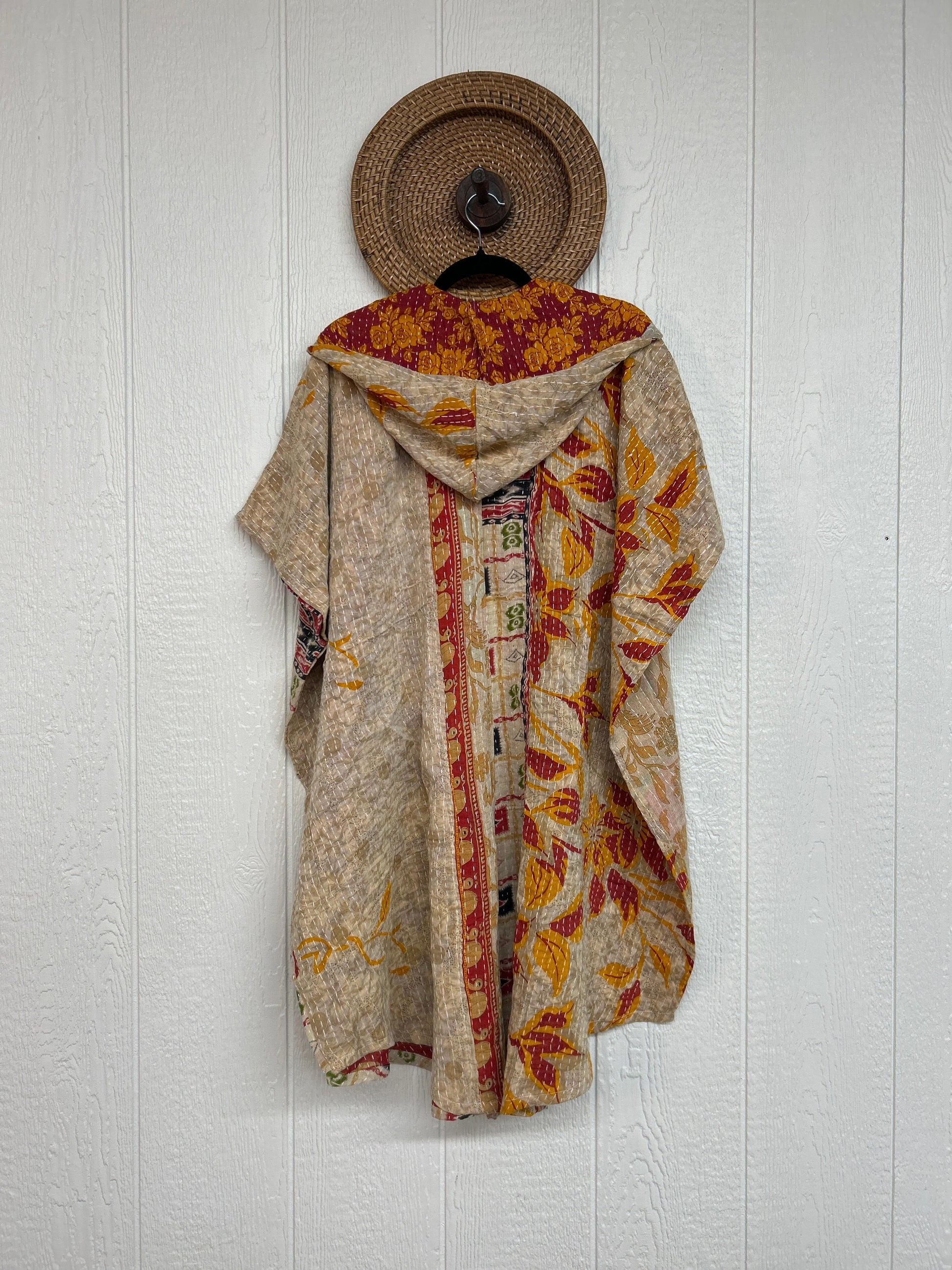 Made from our hand Kantha stitched cotton sari, this one piece wonder features a hood, front button-down closure, pockets, and super flowy shorts. Size Recommended 00-20/22. Crafted and sewn by families in a small village in Northern India, providing work and a fair living.