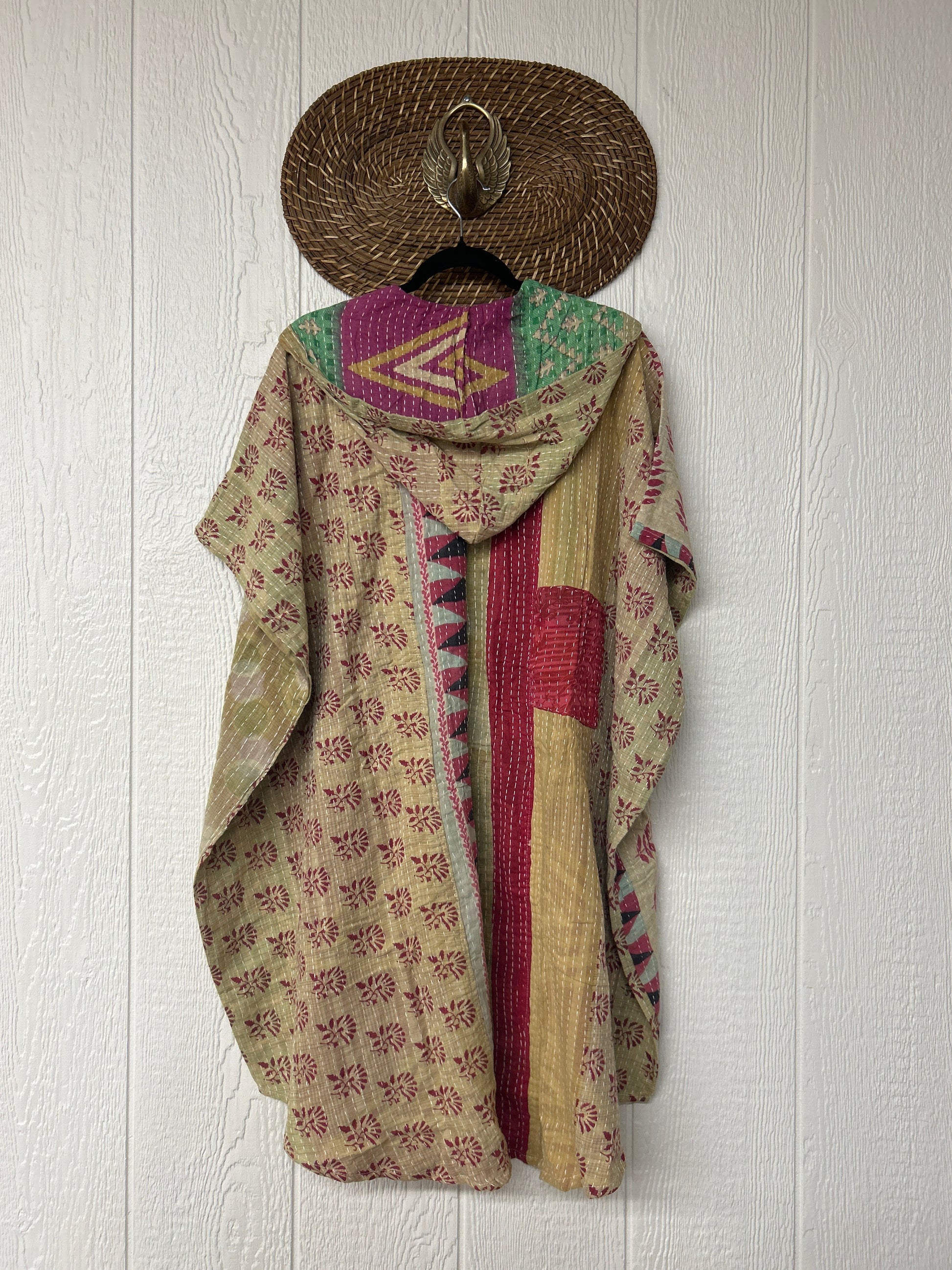 Made from our hand Kantha stitched cotton sari, this one piece wonder features a hood, front button-down closure, pockets, and super flowy shorts. Size Recommended 00-20/22. Crafted and sewn by families in a small village in Northern India, providing work and a fair living.